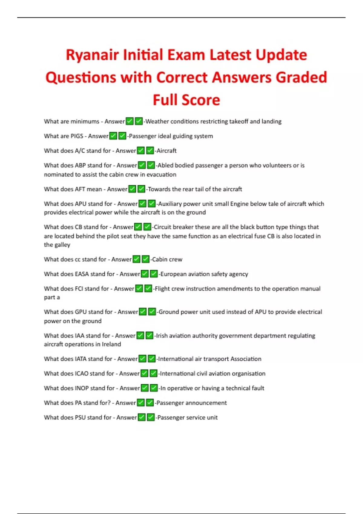Ryanair Initial Exam Latest Update Questions with Correct Answers Graded Full Score