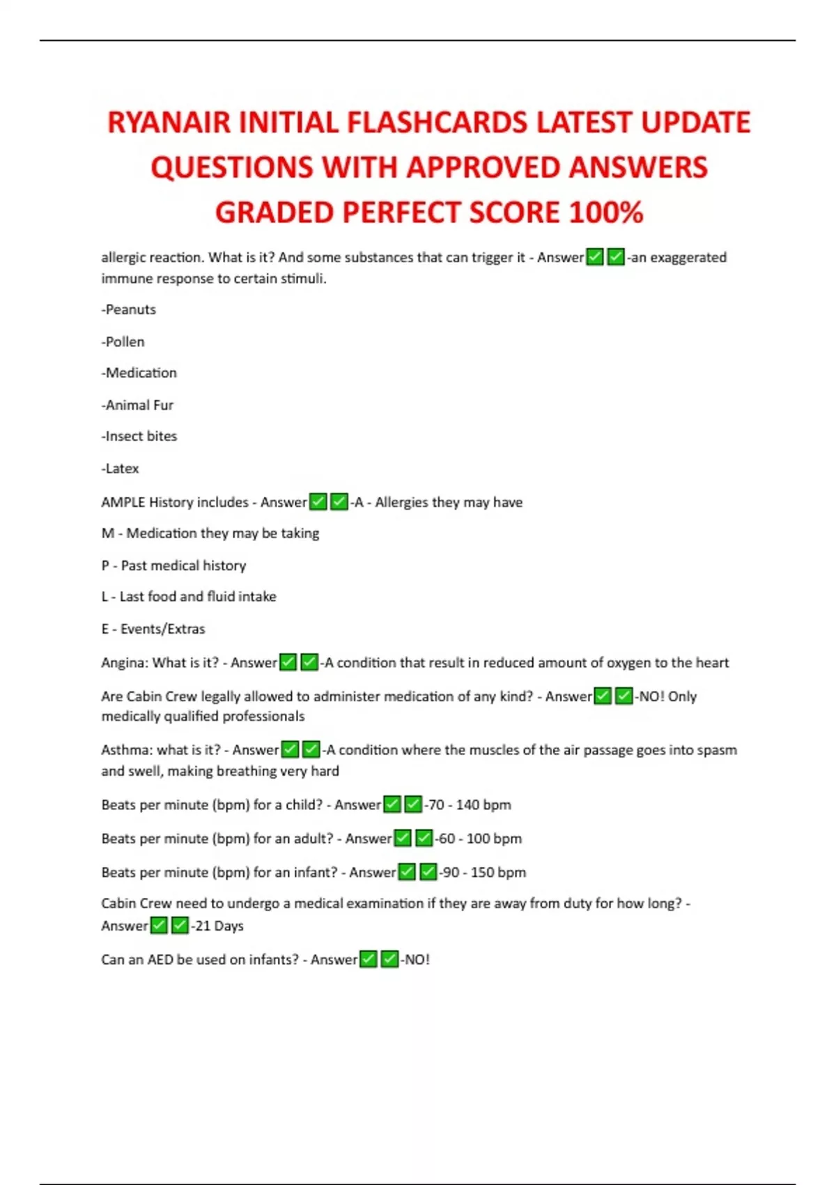 RYANAIR INITIAL FLASHCARDS LATEST UPDATE QUESTIONS WITH APPROVED ANSWERS GRADED PERFECT SCORE 100% allergic reaction. What is it? And some substances that can trigger it - Answer -an exaggerated immune response to certain stimuli. -Peanuts -Pollen -Medication -Animal Fur -Insect bites -Latex AMPLE History includes - Answer -A - Allergies they may have M - Medication they may be taking P - Past medical history L - Last food and fluid intake E - Events/Extras Angina: What is it? - Answer -A condition that result in reduced amount of oxygen to the heart Are Cabin Crew legally allowed to administer medication of any kind? - Answer -NO! Only medically qualified professionals Asthma: what is it? - Answer -A condition where the muscles of the air passage goes into spasm and swell, making breathing very hard