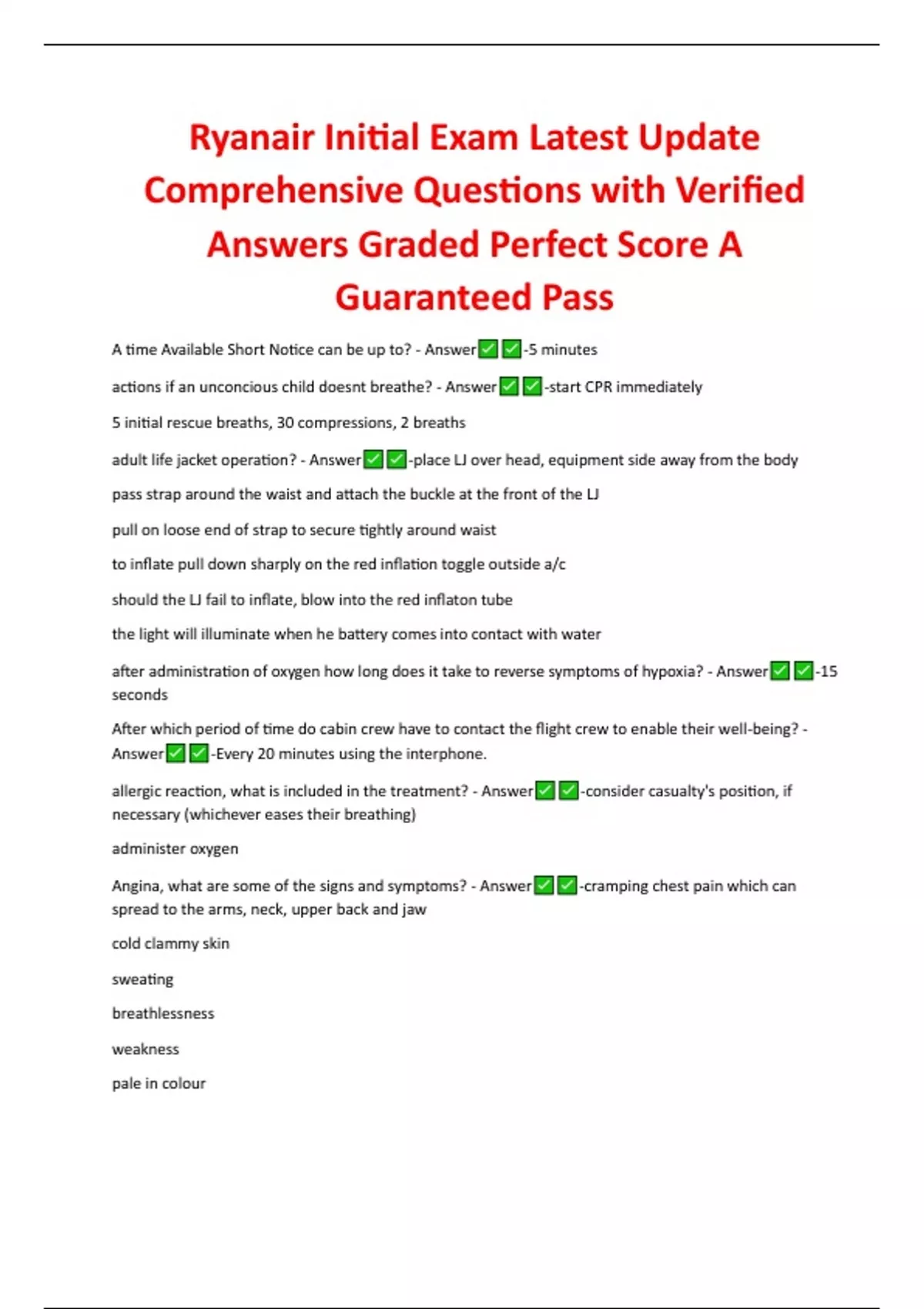 Ryanair Initial Exam Latest Update Comprehensive Questions with Verified Answers Graded Perfect Score A Guaranteed Pass A time Available Short Notice can be up to? - Answer -5 minutes actions if an unconcious child doesnt breathe? - Answer -start CPR immediately 5 initial rescue breaths, 30 compressions, 2 breaths adult life jacket operation? - Answer -place LJ over head, equipment side away from the body pass strap around the waist and attach the buckle at the front of the LJ pull on loose end of strap to secure tightly around waist to inflate pull down sharply on the red inflation toggle outside a/c should the LJ fail to inflate, blow into the red inflaton tube the light will illuminate when he battery comes into contact with water after administration of oxygen how long does it take to reverse symptoms of hypoxia? - Answer -15 seconds After which period of time do cabin crew have to contact the flight crew to enable their well-being? - Answer -Every 20 minutes using the interphone. allergic reaction, what is included in the treatment? - Answer -consider casualty's position, if necessary (whichever eases their breathing) administer oxygen ...................................................................................................