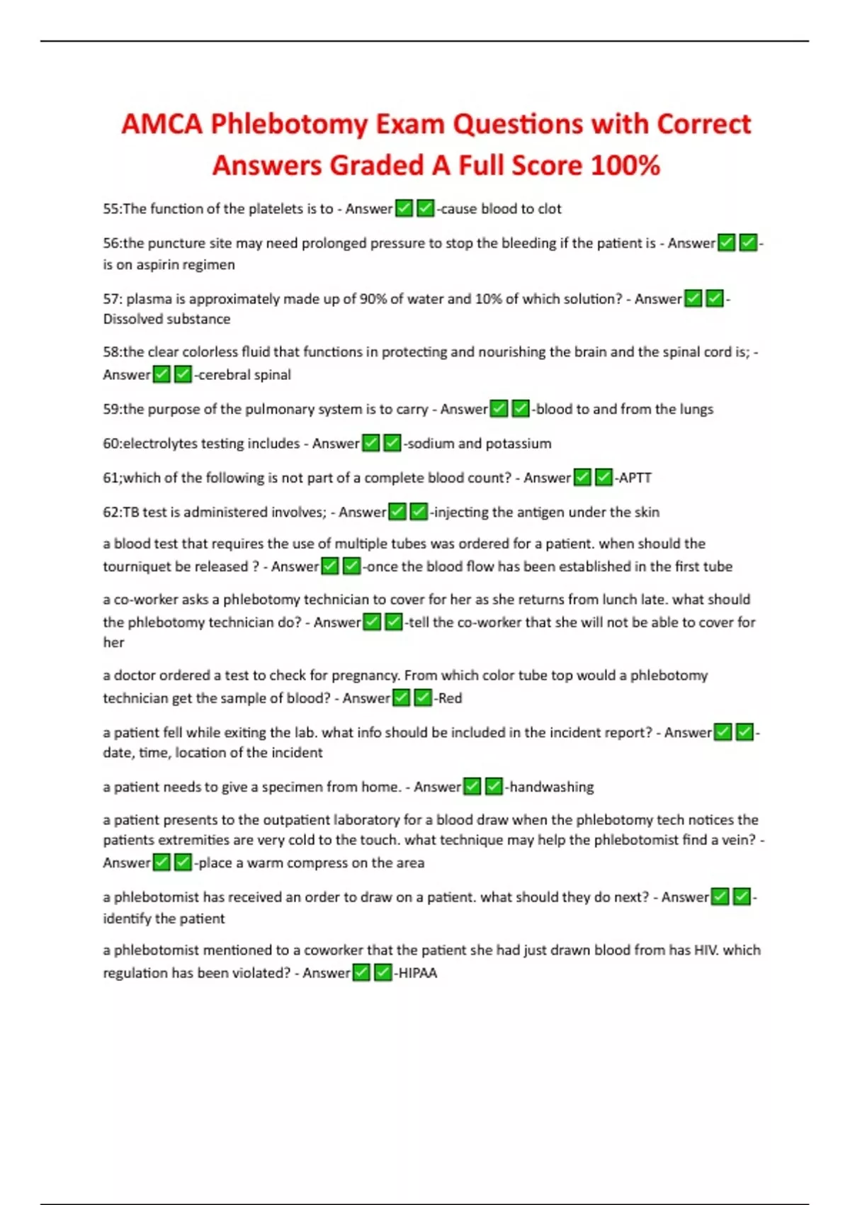 AMCA Phlebotomy Exam Questions with Correct Answers Graded A Full Score 100% 55:The function of the platelets is to - Answer -cause blood to clot 56:the puncture site may need prolonged pressure to stop the bleeding if the patient is - Answer - is on aspirin regimen 57: plasma is approximately made up of 90% of water and 10% of which solution? - Answer - Dissolved substance 58:the clear colorless fluid that functions in protecting and nourishing the brain and the spinal cord is; - Answer -cerebral spinal 59:the purpose of the pulmonary system is to carry - Answer -blood to and from the lungs 60:electrolytes testing includes - Answer -sodium and potassium 61;which of the following is not part of a complete blood count? - Answer -APTT 62:TB test is administered involves; - Answer -injecting the antigen under the skin a blood test that requires the use of multiple tubes was ordered for a patient. when should the tourniquet be released ? - Answer -once the blood flow has been established in the first tube a co-worker asks a phlebotomy technician to cover for her as she returns from lunch late. what should the phlebotomy technician do? - Answer -tell the co-worker that she will not be able to cover for her a doctor ordered a test to check for pregnancy. From which color tube top would a phlebotomy technician get the sample of blood? - Answer -Red a patient fell while exiting the lab. what info should be included in the incident report? - Answer - date, time, location of the incident a patient needs to give a specimen from home. - Answer -handwashing
