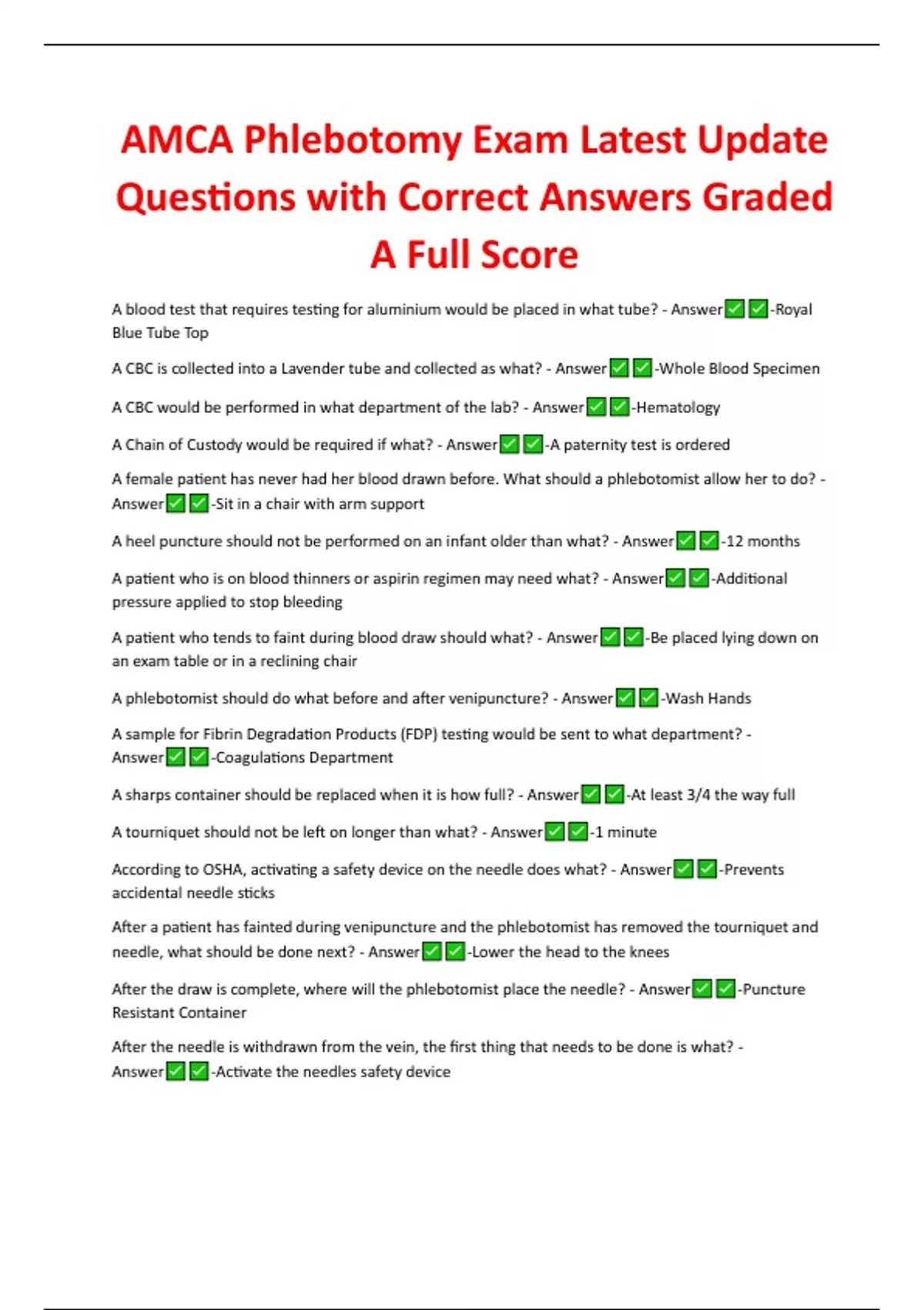 AMCA Phlebotomy Exam Latest Update Questions with Correct Answers Graded A Full Score A blood test that requires testing for aluminium would be placed in what tube? - Answer -Royal Blue Tube Top A CBC is collected into a Lavender tube and collected as what? - Answer -Whole Blood Specimen A CBC would be performed in what department of the lab? - Answer -Hematology A Chain of Custody would be required if what? - Answer -A paternity test is ordered A female patient has never had her blood drawn before. What should a phlebotomist allow her to do? - Answer -Sit in a chair with arm support A heel puncture should not be performed on an infant older than what? - Answer -12 months A patient who is on blood thinners or aspirin regimen may need what? - Answer -Additional pressure applied to stop bleeding A patient who tends to faint during blood draw should what? - Answer -Be placed lying down on an exam table or in a reclining chair A phlebotomist should do what before and after venipuncture? - Answer -Wash Hands A sample for Fibrin Degradation Products (FDP) testing would be sent to what department? - Answer -Coagulations Department A sharps container should be replaced when it is how full? - Answer -At least 3/4 the way full A tourniquet should not be left on longer than what? - Answer -1 minute According to OSHA, activating a safety device on the needle does what? - Answer -Prevents accidental needle sticks