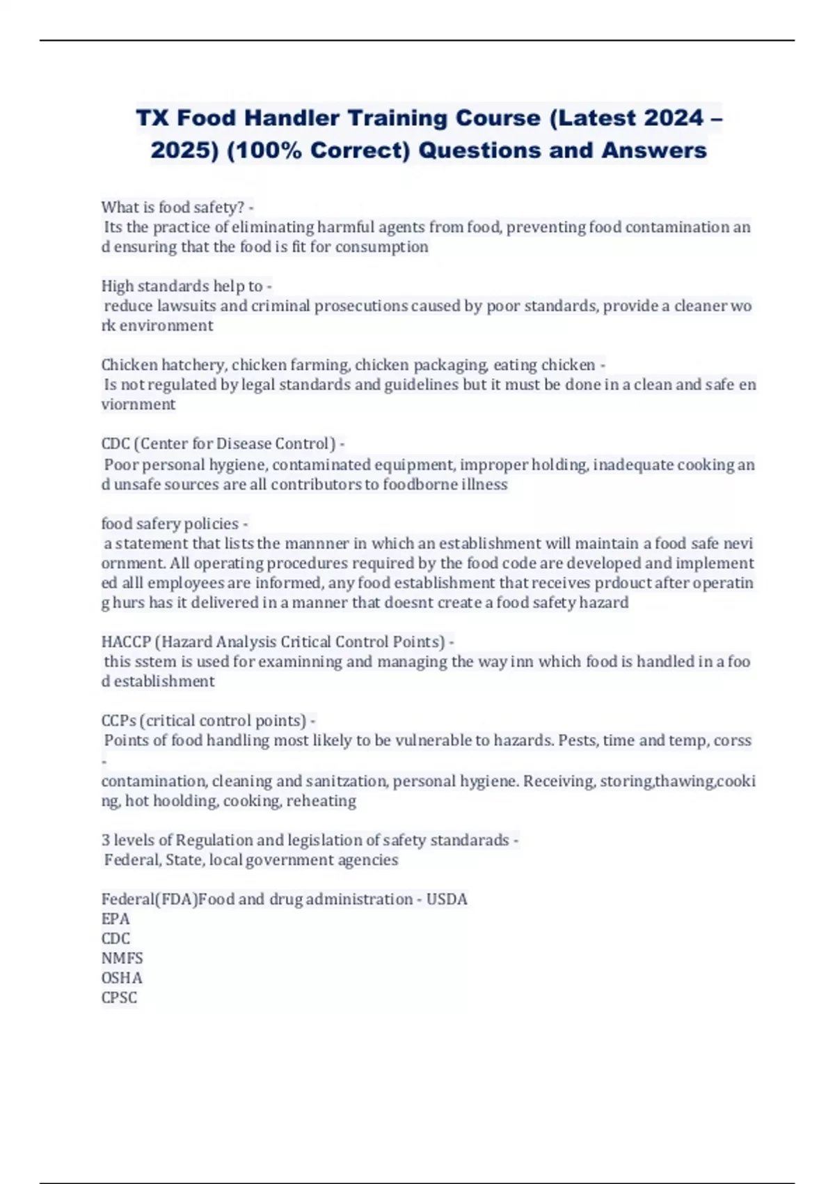 TX Food Handler Training Course (Latest 2024 – 2025) (100% Correct) Questions and Answers