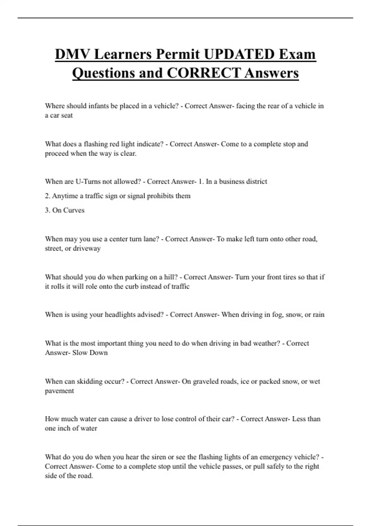 DMV Learners Permit UPDATED Exam Questions and CORRECT Answers Where should infants be placed in a vehicle? - Correct Answer- facing the rear of a vehicle in a car seat What does a flashing red light indicate? - Correct Answer- Come to a complete stop and proceed when the way is clear. When are U-Turns not allowed? - Correct Answer- 1. In a business district 2. Anytime a traffic sign or signal prohibits them