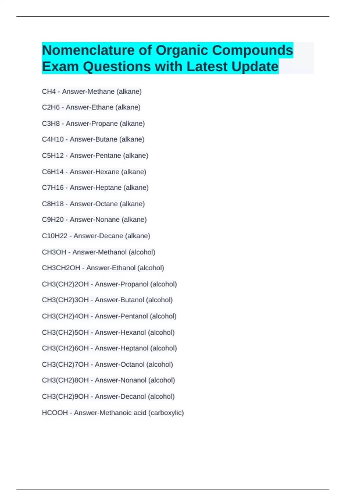 CH4 - Answer-Methane (alkane) C2H6 - Answer-Ethane (alkane) C3H8 - Answer-Propane (alkane) C4H10 - Answer-Butane (alkane) C5H12 - Answer-Pentane (alkane) C6H14 - Answer-Hexane (alkane) C7H16 - Answer-Heptane (alkane) C8H18 - Answer-Octane (alkane) C9H20 - Answer-Nonane (alkane) C10H22 - Answer-Decane (alkane) CH3OH - Answer-Methanol (alcohol) CH3CH2OH - Answer-Ethanol (alcohol) CH3(CH2)2OH - Answer-Propanol (alcohol) CH3(CH2)3OH - Answer-Butanol (alcohol) CH3(CH2)4OH - Answer-Pentanol (alcohol) CH3(CH2)5OH - Answer-Hexanol (alcohol) CH3(CH2)6OH - Answer-Heptanol (alcohol) CH3(CH2)7OH - Answer-Octanol (alcohol) CH3(CH2)8OH - Answer-Nonanol (alcohol) CH3(CH2)9OH - Answer-Decanol (alcohol) HCOOH - Answer-Methanoic acid (carboxylic