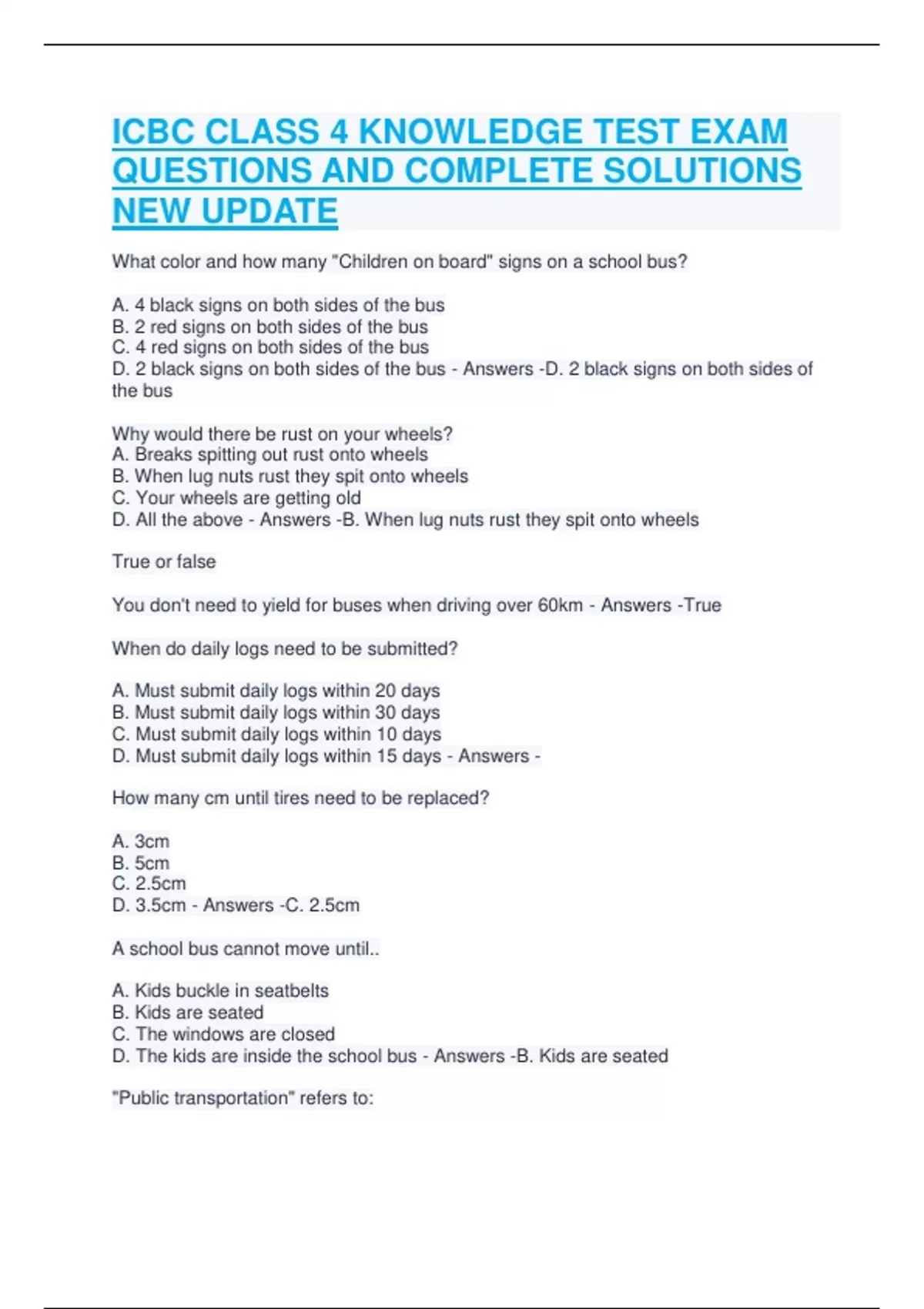 ICBC CLASS 4 KNOWLEDGE TEST EXAM QUESTIONS AND COMPLETE SOLUTIONS NEW UPDATE What color and how many "Children on board" signs on a school bus? A. 4 black signs on both sides of the bus B. 2 red signs on both sides of the bus C. 4 red signs on both sides of the bus D. 2 black signs on both sides of the bus - Answers -D. 2 black signs on both sides of the bus Why would there be rust on your wheels? A. Breaks spitting out rust onto wheels B. When lug nuts rust they spit onto wheels C. Your wheels are getting old D. All the above - Answers -B. When lug nuts rust they spit onto wheels True or false You don't need to yield for buses when driving over 60km - Answers -True When do daily logs need to be submitted? A. Must submit daily logs within 20 days B. Must submit daily logs within 30 days C. Must submit daily logs within 10 days D. Must submit daily logs within 15 days - Answers - How many cm until tires need to be replaced? A. 3cm B. 5cm C. 2.5cm D. 3.5cm - Answers -C. 2.5cm A school bus cannot move until.. A. Kids buckle in seatbelts B. Kids are seated C. The windows are closed D. The kids are inside the school bus - Answers -B. Kids are seated "Public transportation" refers to: A. The transportation of any group of people. B. The transportation of groups of people who are not your associates or members of your family. C. Transportation provided by members of the public. D. All of the above. - Answers -B. The transportation of groups of people who are not your associates or members of your family. A "bus" refers to: A. A motor vehicle which is operated for hire. B. A motor vehicle with a seating capacity of no more than 10 persons, including the driver. C. A motor vehicle which is operated for public transportation. D. A motor vehicle with a seating capacity of more than 10 persons, including the driver, and which is operated for hire or for public transportation. - Answers -D. A motor vehicle with a seating capacity of more than 10 persons, including the driver, and which is operated for hire or for public transportation. A "special activity bus": A. Is operated for a school. B. Does not run on a set schedule. C. Is used for the purpose for which it was manufactured. D. All of the above. - Answers -D. All of the above. A "special vehicle" is: A. A bus which seats more than 10 people. B. A vehicle which seats no more than 10 people, and which provides public transportation for people with disabilities. C. A car or truck you really like. D. A school bus which seats no more than 10 people. - Answers -B. A vehicle which seats no more than 10 people, and which provides public transportation for people with disabilities.