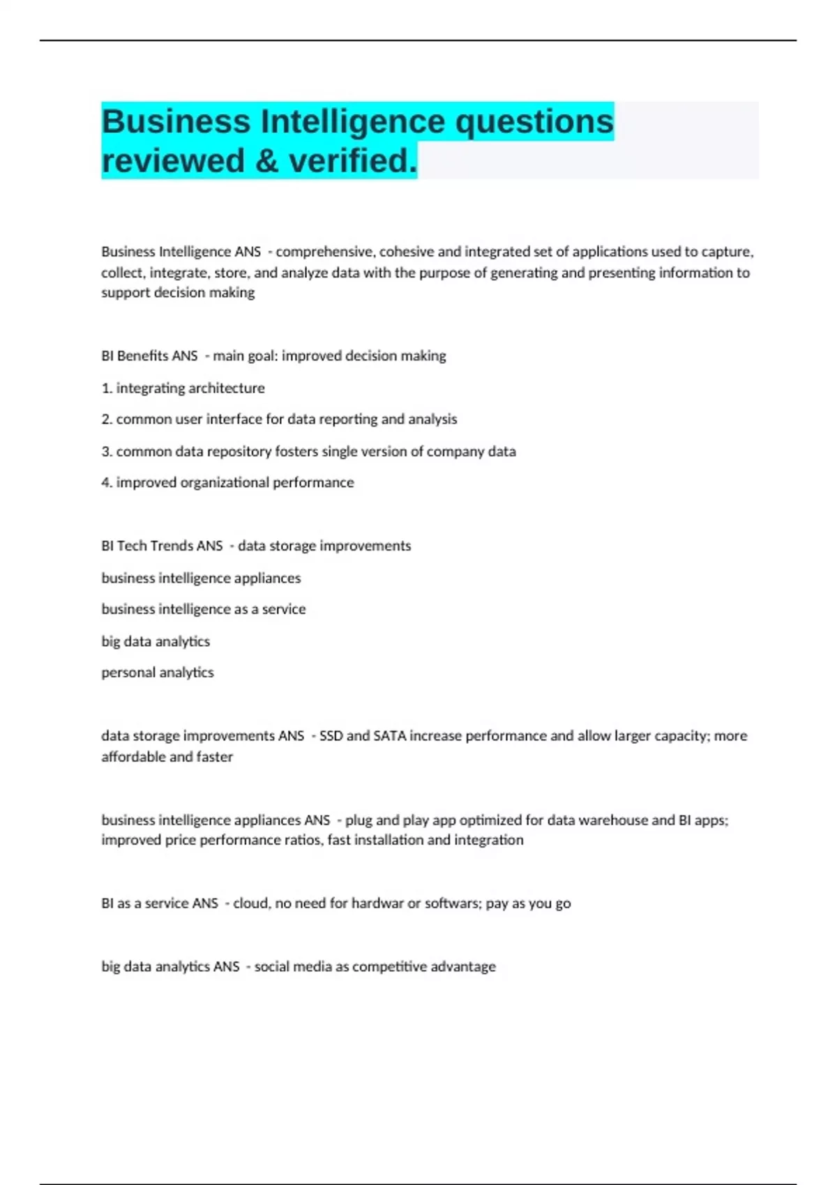 BI as a service ANS - cloud, no need for hardwar or softwars; pay as you go