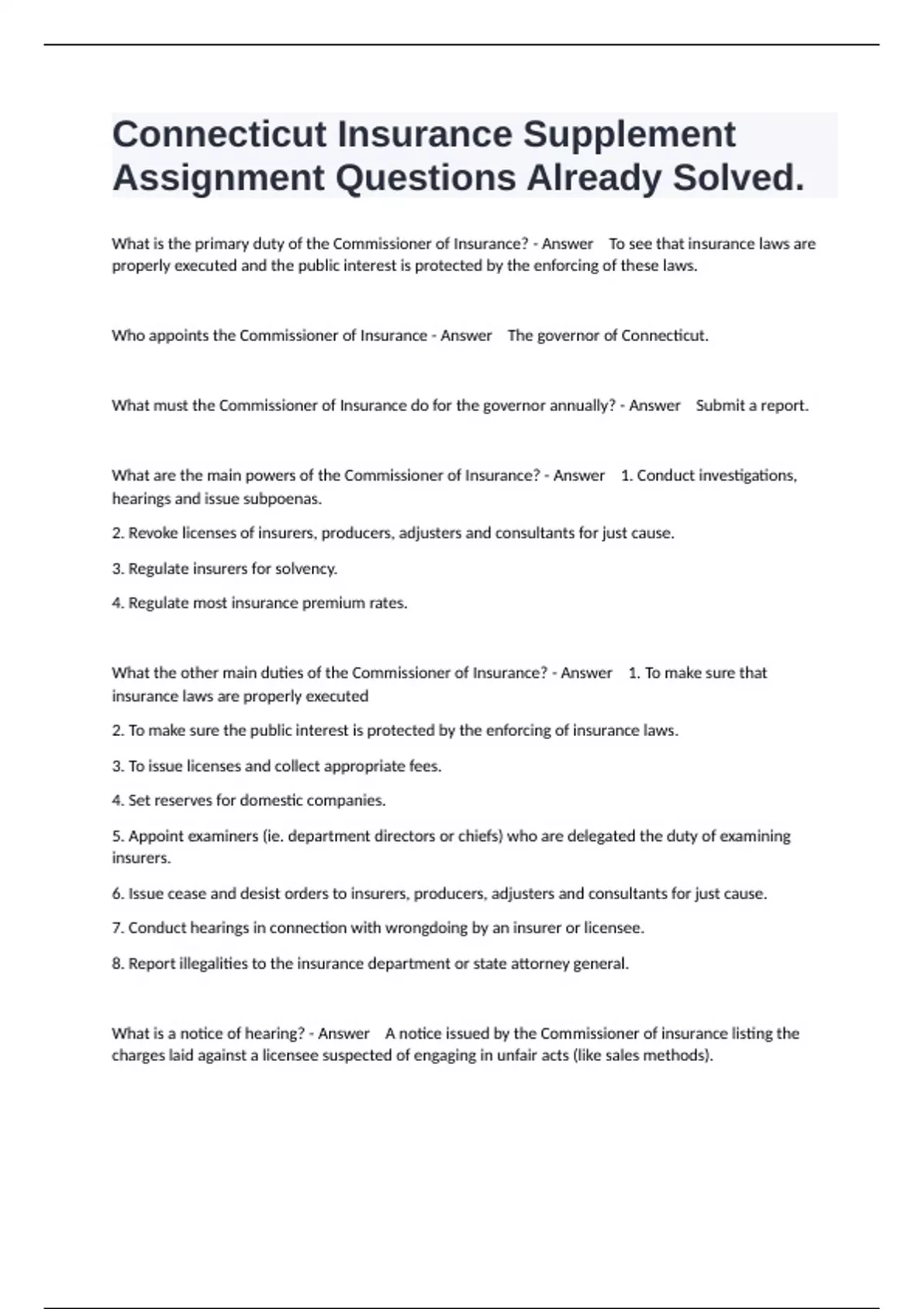 Who appoints the Commissioner of Insurance - Answer The governor of Connecticut.