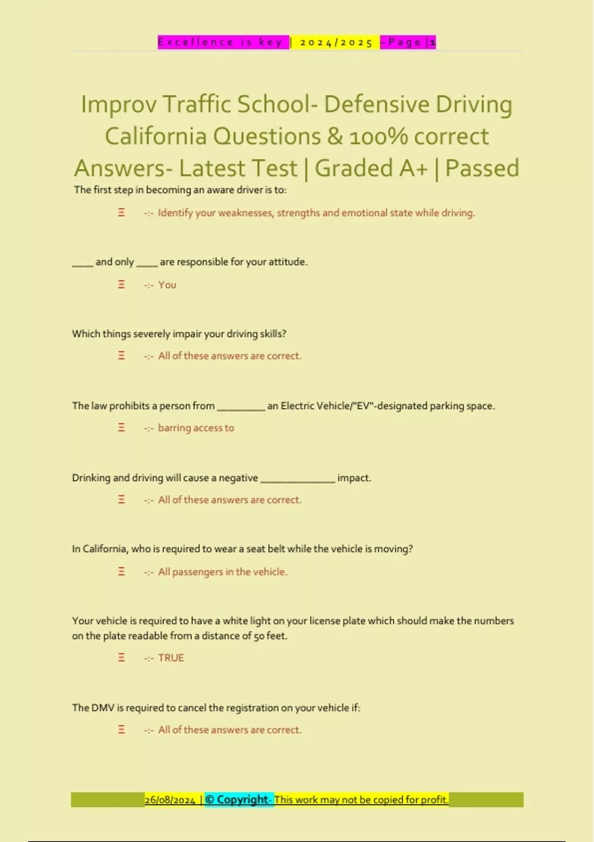 The first step in becoming an aware driver is to: Ξ -:- Identify your weaknesses, strengths and emotional state while driving. ____ and only ____ are responsible for your attitude. Ξ -:- You Which things severely impair your driving skills? Ξ -:- All of these answers are correct. The law prohibits a person from _________ an Electric Vehicle/"EV"-designated parking space. Ξ -:- barring access to Drinking and driving will cause a negative ______________ impact. Ξ -:- All of these answers are correct. In California, who is required to wear a seat belt while the vehicle is moving? Ξ -:- All passengers in the vehicle. Your vehicle is required to have a white light on your license plate which should make the numbers on the plate readable from a distance of 50 feet. Ξ -:- TRUE The DMV is required to cancel the registration on your vehicle if: Ξ -:- All of these answers are correct. E x c e l l e n c e i s k e y | 2 0 2 4 / 2 0 2 5 ~ P a g e | 2 26/08/2024 | © Copyright- This work may not be copied for profit. Kaitlyn's Law prohibits parents or guardians from leaving a child 6 years old or under in a vehicle unattended without the supervision of a person who is 12 years of age or older. Ξ -:- TRUE All drivers or passengers of motorcycles, motor-driven cycles, or motorized bicycles are required by California law to wear a safety helme