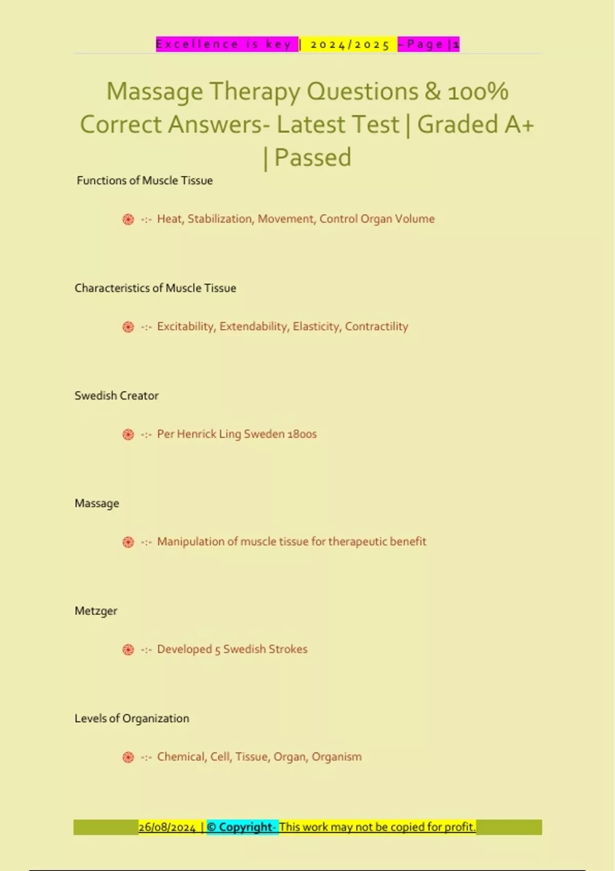 Functions of Muscle Tissue ֎ -:- Heat, Stabilization, Movement, Control Organ Volume Characteristics of Muscle Tissue ֎ -:- Excitability, Extendability, Elasticity, Contractility Swedish Creator ֎ -:- Per Henrick Ling Sweden 1800s Massage ֎ -:- Manipulation of muscle tissue for therapeutic benefit Metzger ֎ -:- Developed 5 Swedish Strokes Levels of Organization ֎ -:- Chemical, Cell, Tissue, Organ, Organism E x c e l l e n c e i s k e y | 2 0 2 4 / 2 0 2 5 ~ P a g e | 2 26/08/2024 | © Copyright- This work may not be copied for profit. Condyle ֎ -:- Large rounded prominence forming a joint Joint ֎ -:- Closing of articulating Integumentary system ֎ -:- Skin, Nail, Hair Benefits of ROM ֎ -:- promote flexibility, corrects subluxations, promotes proprioception, gives therapist baseline Trigger Point Pioneer ֎ -:- Janet Travell Myofascial Trigger point ֎ -:- painful taut area that refers pain to another area, palpable band, limited ROM, client has known pain Active Trp E x c e l l e n c e i s k e y | 2 0 2 4 / 2 0 2 5 ~ P a g e | 3 26/08/2024 | © Copyright- This work may not be copied for profit. ֎ -:- Referral pain Latent Trp ֎ -:- No referral pain Corpus Luteum ֎ -:- remains of ovarian follicle secretes variety of reproductive hormones Is Crohns disease Contraindicated? ֎ -:- Avoid Abdomen Is IBS Contraindicated? ֎ -:- Avoid Abdomen Are inactive gallstones Contraindicated? ֎ -:- Local contra indicated below R Ribcage Who developed NMT? ֎ -:- Stanley Lief E x c e l l e n c e i s k e y | 2 0 2 4 / 2 0 2 5 ~ P a g e | 4 26/08/2024 | © Copyright- This work may not be copied for profit. Who is current day educator of NMT