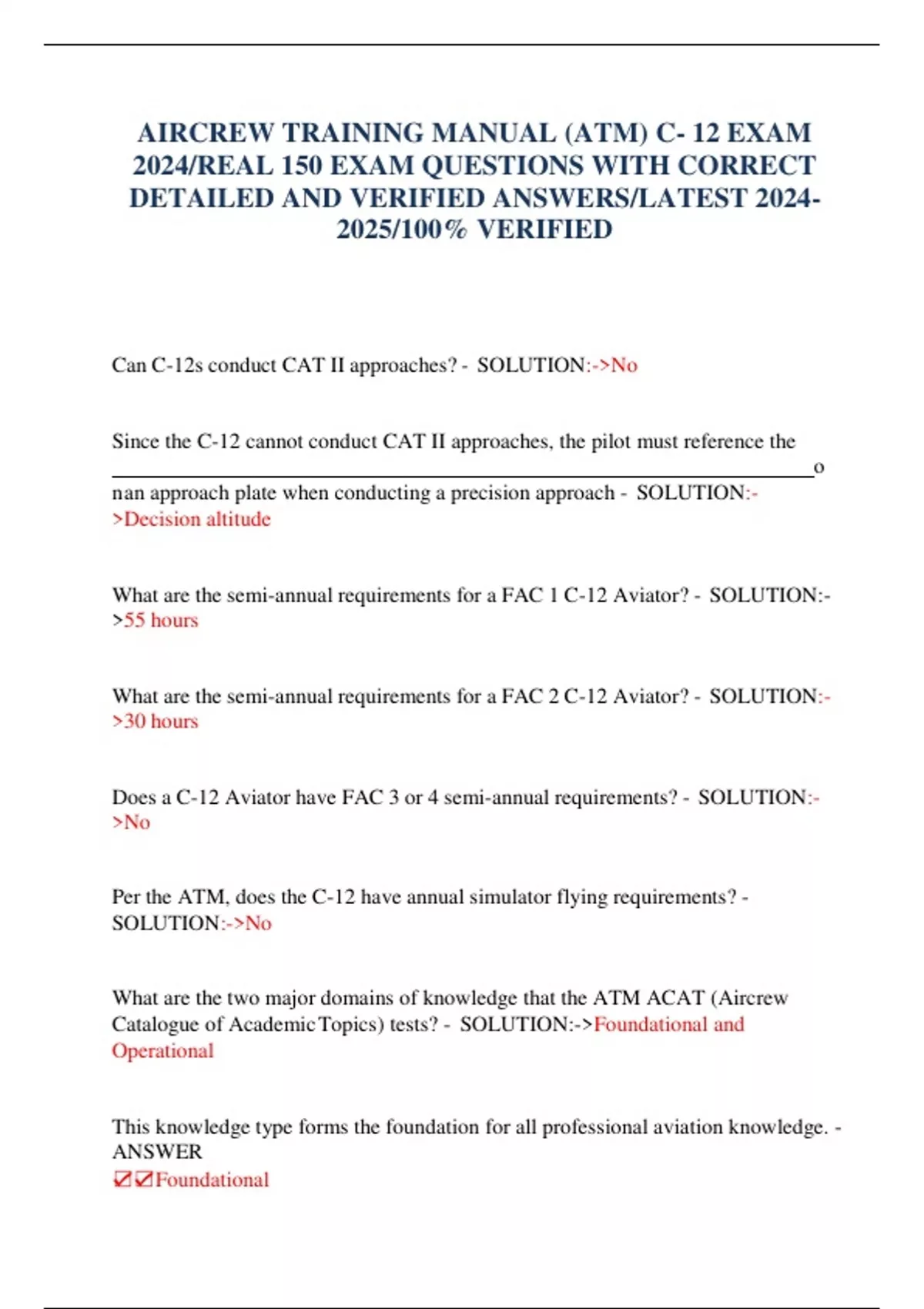 AIRCREW TRAINING MANUAL (ATM) C- 12 EXAM 2024/REAL 150 EXAM QUESTIONS WITH CORRECT DETAILED AND VERIFIED ANSWERS/LATEST /100% VERIFIED