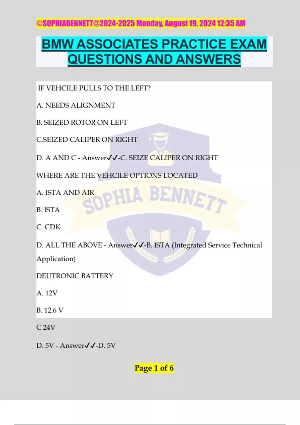 BMW ASSOCIATES PRACTICE EXAM QUESTIONS AND ANSWERS IF VEHCILE PULLS TO THE LEFT? A. NEEDS ALIGNMENT B. SEIZED ROTOR ON LEFT C.SEIZED CALIPER ON RIGHT D. A AND C - Answer️️ -C. SEIZE CALIPER ON RIGHT WHERE ARE THE VEHCILE OPTIONS LOCATED A. ISTA AND AIR B. ISTA C. CDK D. ALL THE ABOVE - Answer️️ -B. ISTA (Integrated Service Technical Application) DEUTRONIC BATTERY A. 12V B. 12.6 V C 24V D. 5V - Answer️️ -D. 5V ©SOPHIABENNETT@ Monday, August 19, 2024 12:35 AM Page 2 of 6 HOW DO YOU MEASURE WHEEL PLAY WHAT IS RADIAL AND LATERAL? A. RADIAL = UP DOWN / LATERAL = SIDE TO SIDE B. RADIAL = SIDE TO SIDE / LATERAL= UP AND DOWN C. RADIAL = PUSH AND PULL / LATERAL = SIDE TO SIDE D. NONE OF THE ABOVE - Answer️️ -A. RADIAL = UP DOWN / LATERAL = SIDE TO SIDE ADHESIVE ON BREAK PADS A. ONE TIME USE B. A ONLY C. HOLD IT TO SET IT WITH PISTON D. A AND C - Answer️️ -D. ONE TIME USE AND HOLD I