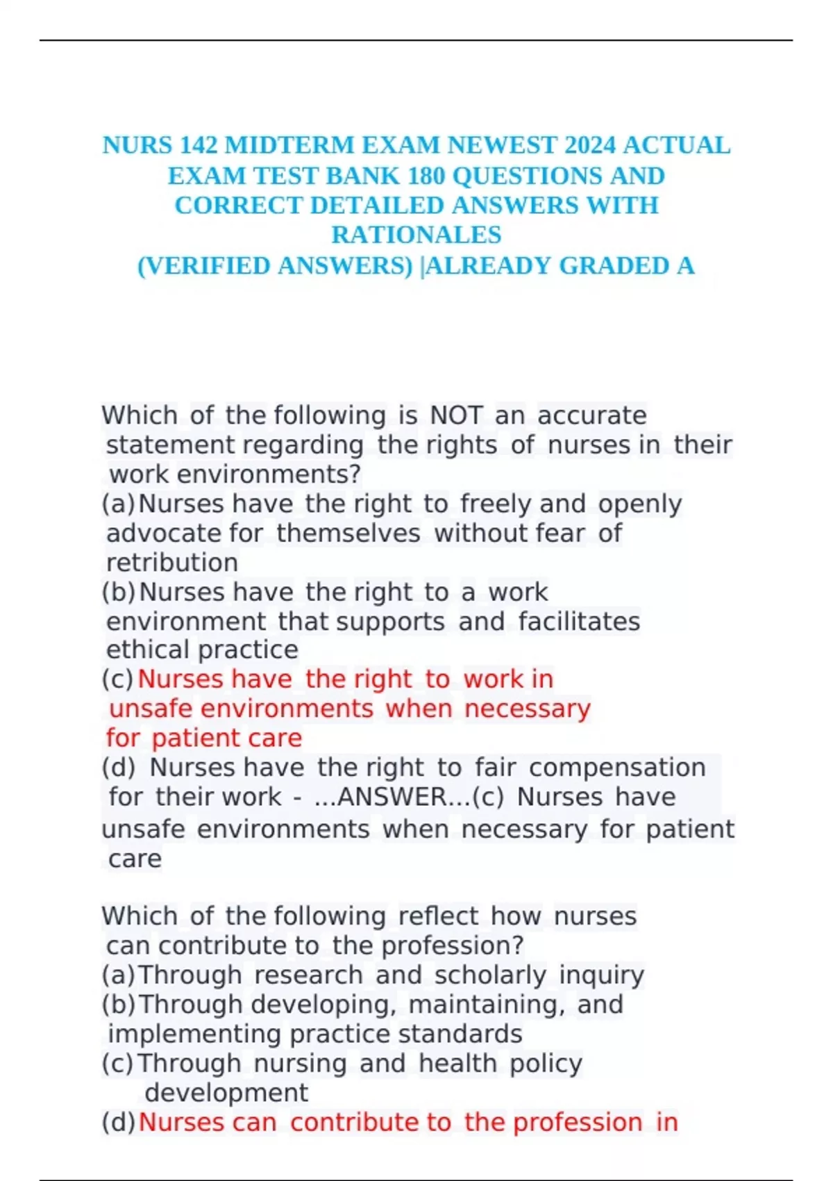 NURS 142 MIDTERM EXAM NEWEST 2024 ACTUAL EXAM TEST BANK 180 QUESTIONS AND CORRECT DETAILED ANSWERS WITH RATIONALES (VERIFIED ANSWERS) |ALREADY GRADED A