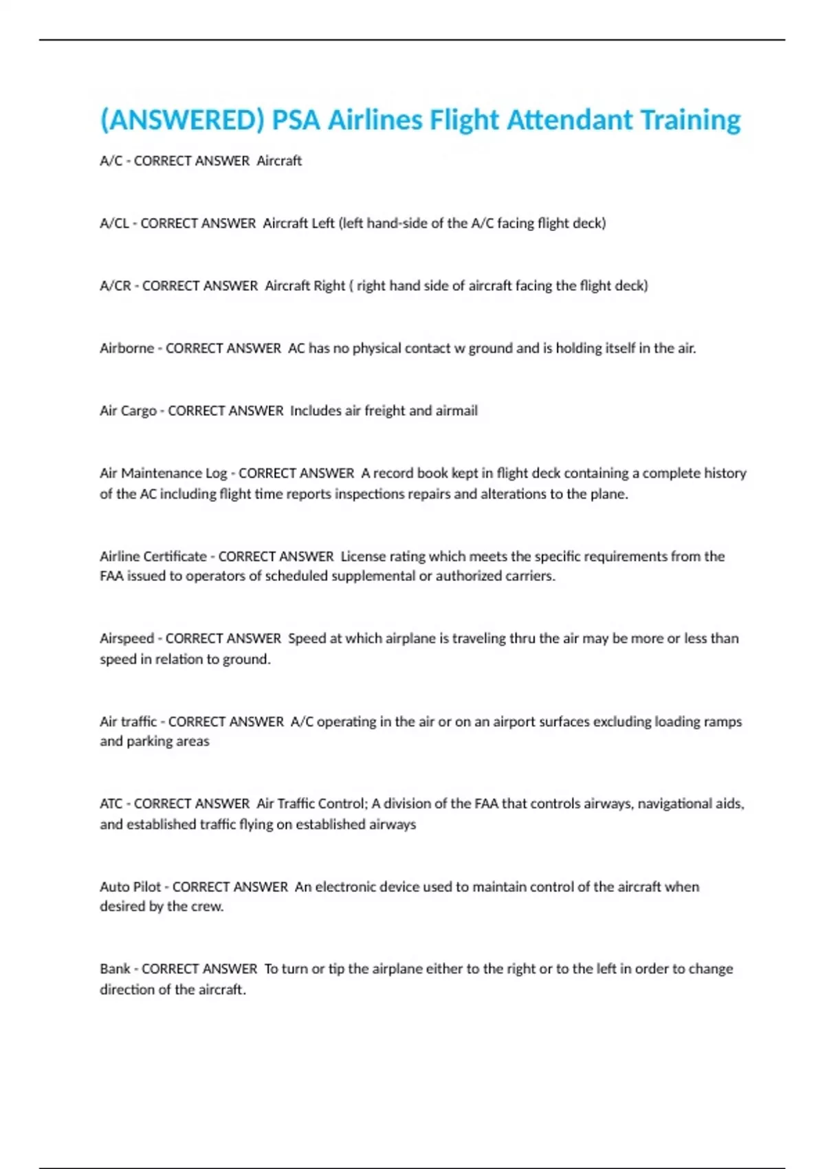A/C - CORRECT ANSWER Aircraft A/CL - CORRECT ANSWER Aircraft Left (left hand-side of the A/C facing flight deck) A/CR - CORRECT ANSWER Aircraft Right ( right hand side of aircraft facing the flight deck) Airborne - CORRECT ANSWER AC has no physical contact w ground and is holding itself in the air. Air Cargo - CORRECT ANSWER Includes air freight and airmail Air Maintenance Log - CORRECT ANSWER A record book kept in flight deck containing a complete history of the AC including flight time reports inspections repairs and alterations to the plane. Airline Certificate - CORRECT ANSWER License rating which meets the specific requirements from the FAA issued to operators of scheduled supplemental or authorized carriers. Airspeed - CORRECT ANSWER Speed at which airplane is traveling thru the air may be more or less than speed in relation to ground. Air traffic - CORRECT ANSWER A/C operating in the air or on an airport surfaces excluding loading ramps and parking areas ATC - CORRECT ANSWER Air Traffic Control; A division of the FAA that controls airways, navigational aids, and established traffic flying on established airways Auto Pilot - CORRECT ANSWER An electronic device used to maintain control of the aircraft when desired by the crew. Bank - CORRECT ANSWER To turn or tip the airplane either to the right or to the left in order to change direction of the aircraft.