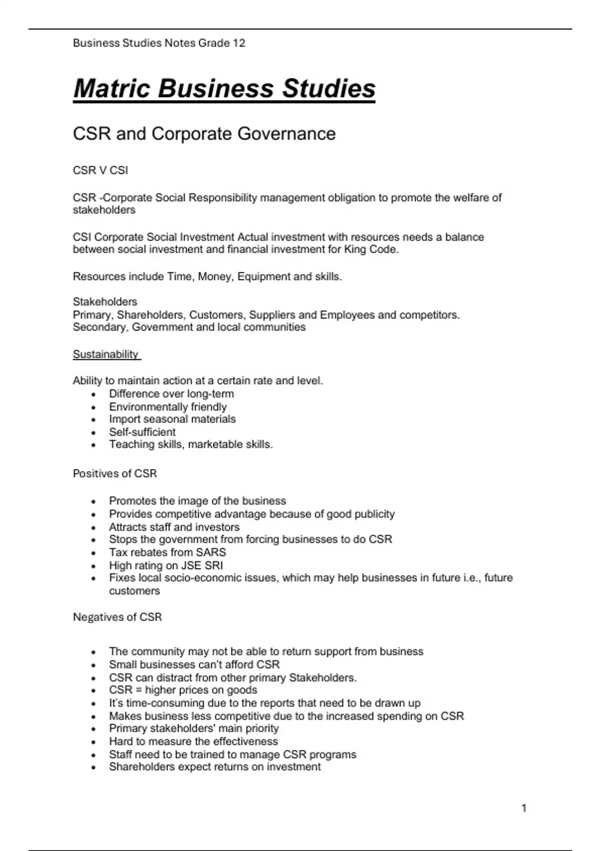 , Business Studies Notes Grade 12