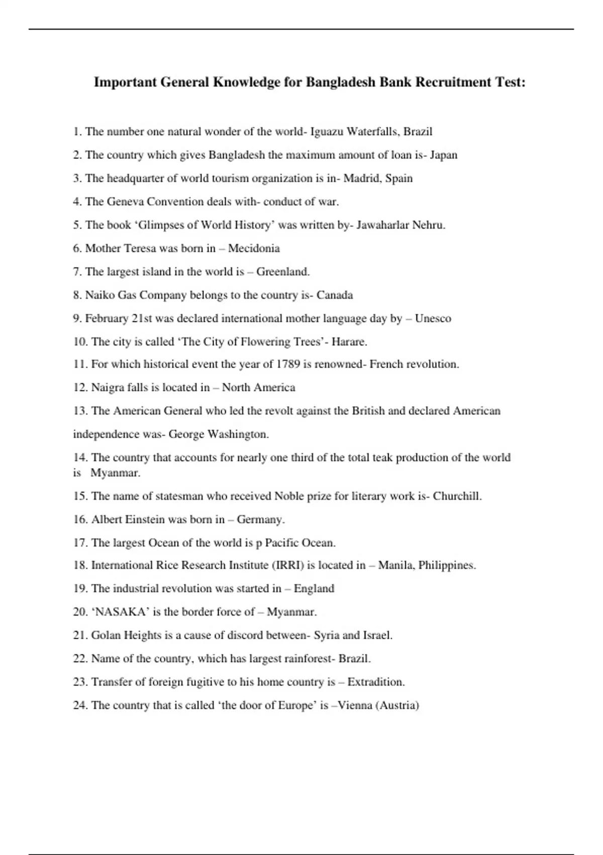 Important General Knowledge for Bangladesh Bank Recruitment Test: 1. The number one natural wonder of the world- Iguazu Waterfalls, Brazil 2. The country which gives Bangladesh the maximum amount of loan is- Japan 3. The headquarter of world tourism organization is in- Madrid, Spain 4. The Geneva Convention deals with- conduct of war. 5. The book ‘Glimpses of World History’ was written by- Jawaharlar Nehru. 6. Mother Teresa was born in – Mecidonia 7. The largest island in the world is – Greenland. 8. Naiko Gas Company belongs to the country is- Canada 9. February 21st was declared international mother language day by – Unesco 10. The city is called ‘The City of Flowering Trees’- Harare. 11. For which historical event the year of 1789 is renowned- French revolution. 12. Naigra falls is located in – North America 13. The American General who led the revolt against the British and declared American independence was- George Washington. Myanmar. 14. The country that accounts for nearly one third of the total teak production of the world is 15. The name of statesman who received Noble prize for literary work is- Churchill. 16. Albert Einstein was born in – Germany. 17. The largest Ocean of the world is p Pacific Ocean. 18. International Rice Research Institute (IRRI) is located in – Manila, Philippines. 19. The industrial revolution was started in – England 20. ‘NASAKA’ is the border force of – Myanmar. 21. Golan Heights is a cause of discord between- Syria and Israel. 22. Name of the country, which has largest rainforest- Brazil. 23. Transfer of foreign fugitive to his home country is – Extradition. 24. The country that is called ‘the door of Europe’ is –Vienna (Austria) 25. Nelson Mandela was born in – 18 July 1918 26. Bangladesh workers safety initiative was declared by – Alliance for workers safety in Washington. 27. Who is Edwared Snowden? – A former official of central intelligence agency (CIA) who leaked surveillance programme of the USA. 28. Name of newly elected party in Bhutan – Peoples Democratic Party (PDP) 29. General Aung San, who was the father of Aung San Suu Kyi assassinated on – 19 July 1947. 30. Who is the Chief justice of India (CJI) at present? Justice P Sathasivam. 31. President Mohamed Morsi was ousted on – 03 July 2013 32. Adly Mansour takes oath as interim President of Egypt on – 04 July 2013 33. Malala Yousafzai delivered her speech at the UN on- 12 July 2013. 34. Who is the interim Prime Minister of Egypt- Hazem el Beblawi. 35. Che Guevara was born on – 14 June 1928 in Argentina. 36. Black teenager of America Trayvon Martin was killed by – George Zimmerman. 37. The most innovative country according to the Global innovation Index (GII) is- Switzerland. 38. Mahatma Gandhi was assassinated on – 30 January 1948 By Nathuram Godse. 39. British Foreign Minister at present is – William Hague. 40. The major export partner country of Bangladesh is – the USA. 41. At present number of offices of the central Bank countrywide is – 10 42. Taka 10 polymer note was first introduced in Bangladesh 2000. 43. The Euro introduced to world Financial market – 1 January 1999. 44. The Chittagong Stock Exchange was established in – 1995 45. The apex body of the private sector business community in Bangladesh is –FBCCI. 46. The act adopted for prevention of use and transfer of money illegally is called – Money Laundering Prevention Act. 47. BIA stand for – Bangladesh Insurance Academy. 48. The largest trading block in the world is –WTO. 49. A common form of inter bank short term borrowing is – call money 50. CAMEL rating is a system that – assigns a numerical rating to a bank. 51. SWIFT is – A global fund transfer system. 52. Import quotas tend to be associated with – expand domestic production and sales. 53. The rate at which commercial banks borrow money from the central bank is called – bank rate. 54. Circuit breaker in a stock exchange works as – an obstacle to excessive change in share price. 55. In Islamic Banking the customer are consider as- partners to profit sharing. 56. The headquarter of Center on Integrated Rural Development for Asia and the Pacific (CIRDAP) is in – Dhaka. 57. Dhaka Carzon Hall was build in the year – 1904-05. 58. The largest tribe in Bangladesh is – Chaqma. 59. The length of Jamuna Bridge is – 4.8 km. 60. The documentary film ‘Stop Genocide’ related to independence war of Bangladesh was directed by – Zahir Raihan. 61. The last Mughal Emperor was – Bahadur Shah. 62. Who compiled and edited the documents of liberation war of Bangladesh – Hasan Hafizur Rahman. 63. Introduction of the book ‘ Song Offerings’ of Rabindranath Tagore is written by – W.B. Yeats. 64. Most of the Manipuri ethnic group people of Bangladesh live in – Sylhet. 65. The Arabian Country first recognized Bangladesh as an independence country- Iraq. 66. The largest island of Bangladesh is – Bhola. 67. The current population growth rate in Bangladesh is -1.37%. 68. The ancient name of Barisal is –Chandradeep. 69. Bangladesh constitution was adopted on -16 December 1972. 70. The name of highest gallantry award of Bangladesh is – Bir Shrestha. 71. The governance structure of Bangladesh is – parliamentary. 72. The authority to issue an ordinance in Bangladesh is – President.