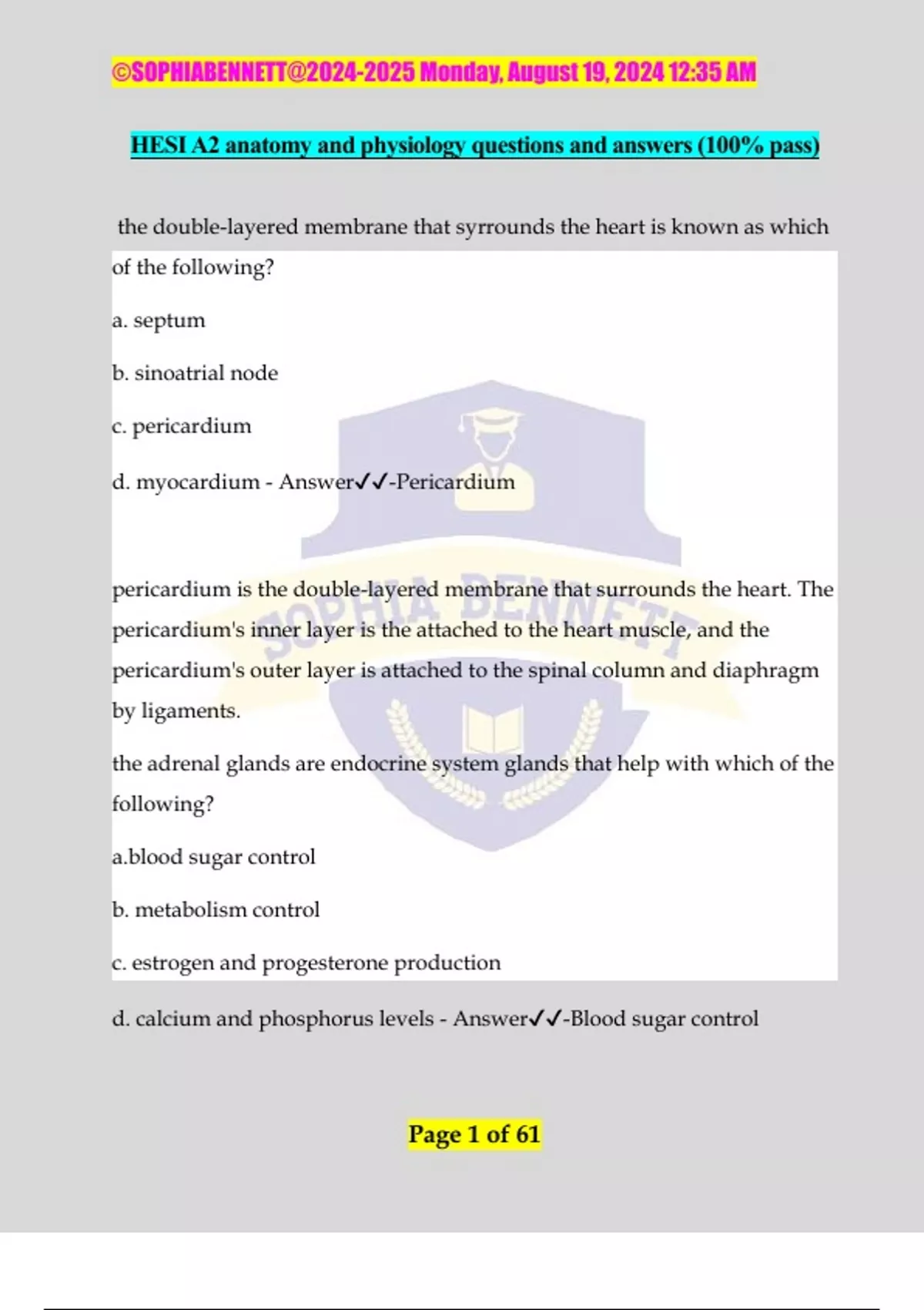 HESI A2 anatomy and physiology questions and answers (100% pass)