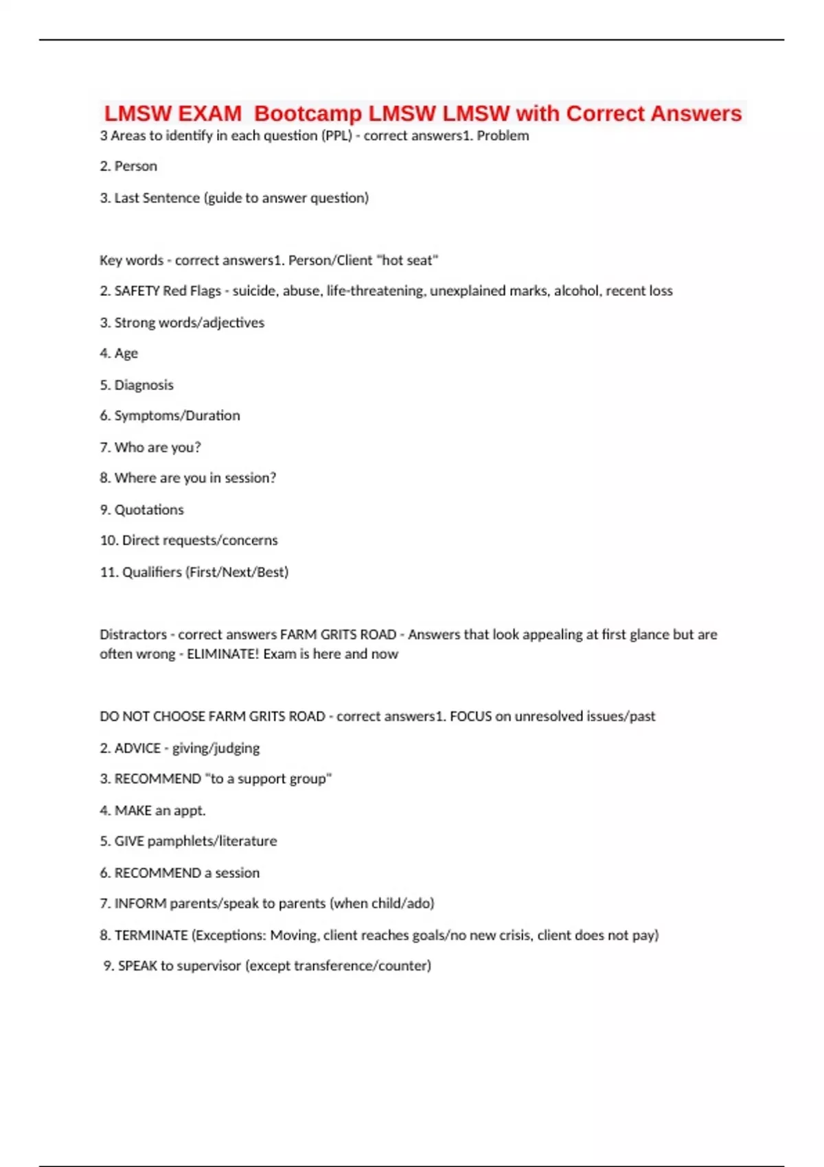 LMSW EXAM Bootcamp LMSW LMSW with Correct Answers 3 Areas to identify in each question (PPL) - correct answers1. Problem 2. Person 3. Last Sentence (guide to answer question) Key words - correct answers1. Person/Client "hot seat" 2. SAFETY Red Flags - suicide, abuse, life-threatening, unexplained marks, alcohol, recent loss 3. Strong words/adjectives 4. Age 5. Diagnosis 6. Symptoms/Duration 7. Who are you? 8. Where are you in session? 9. Quotations 10. Direct requests/concerns 11. Qualifiers (First/Next/Best) Distractors - correct answers FARM GRITS ROAD - Answers that look appealing at first glance but are often wrong - ELIMINATE! Exam is here and now DO NOT CHOOSE FARM GRITS ROAD - correct answers1. FOCUS on unresolved issues/past 2. ADVICE - giving/judging 3. RECOMMEND "to a support group" 4. MAKE an appt. 5. GIVE pamphlets/literature 6. RECOMMEND a session 7. INFORM parents/speak to parents (when child/ado) 8. TERMINATE (Exceptions: Moving, client reaches goals/no new crisis, client does not pay) 9. SPEAK to supervisor (except transference/counter)