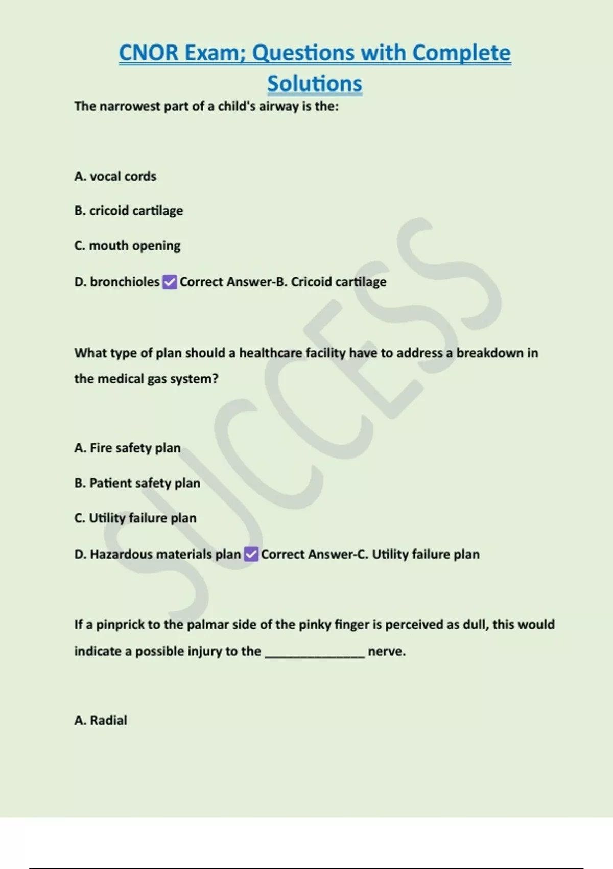 CNOR Exam; Questions with Complete Solutions The narrowest part of a child's airway is the: A. vocal cords B. cricoid cartilage C. mouth opening D. bronchioles Correct Answer-B. Cricoid cartilage