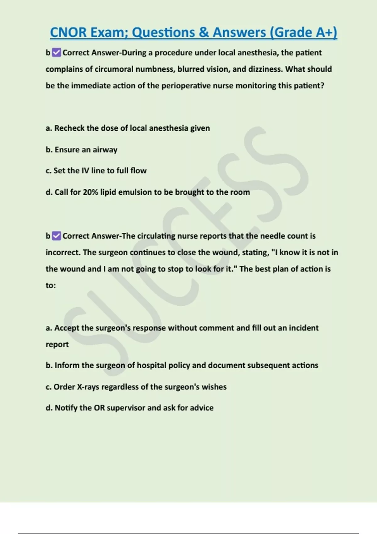 CNOR Exam; Questions & Answers (Grade A+) b Correct Answer-During a procedure under local anesthesia, the patient complains of circumoral numbness, blurred vision, and dizziness. What should be the immediate action of the perioperative nurse monitoring this patient? a. Recheck the dose of local anesthesia given b. Ensure an airway c. Set the IV line to full flow d. Call for 20% lipid emulsion to be brought to the room