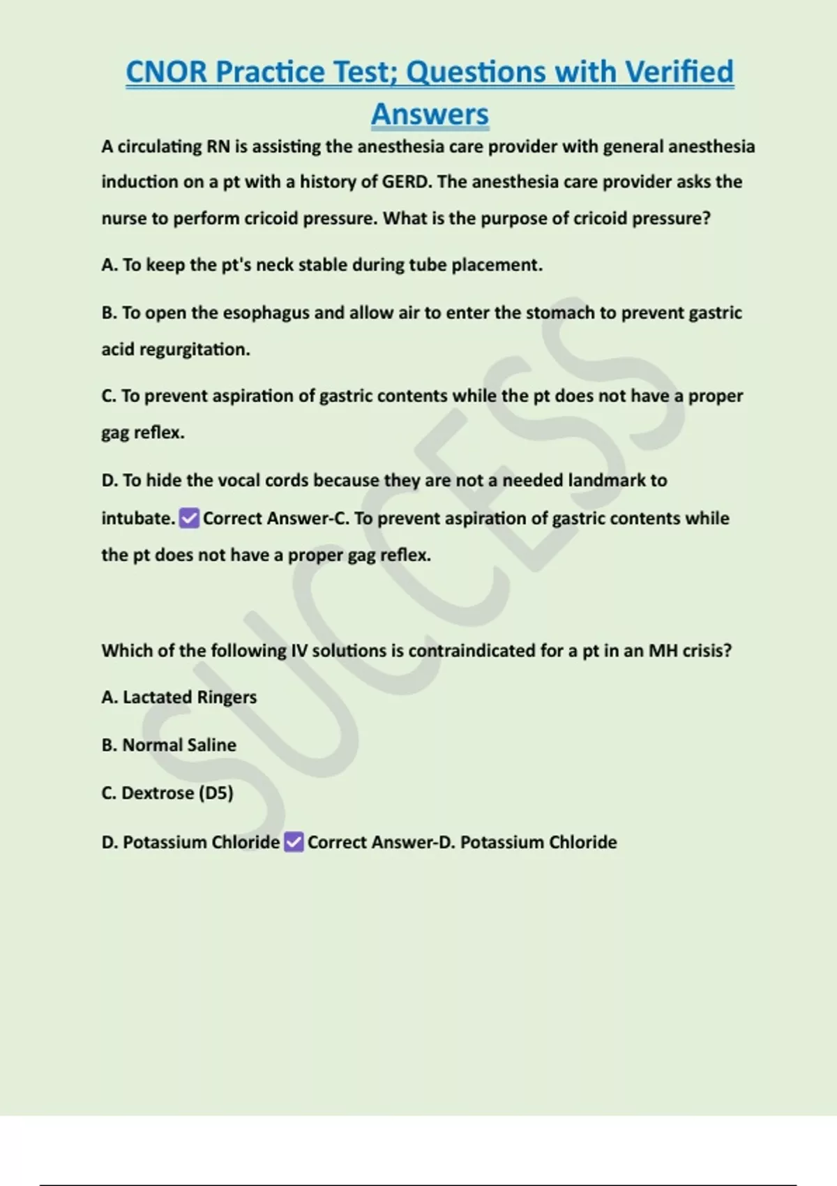 D. Potassium Chloride Correct Answer-D. Potassium Chloride