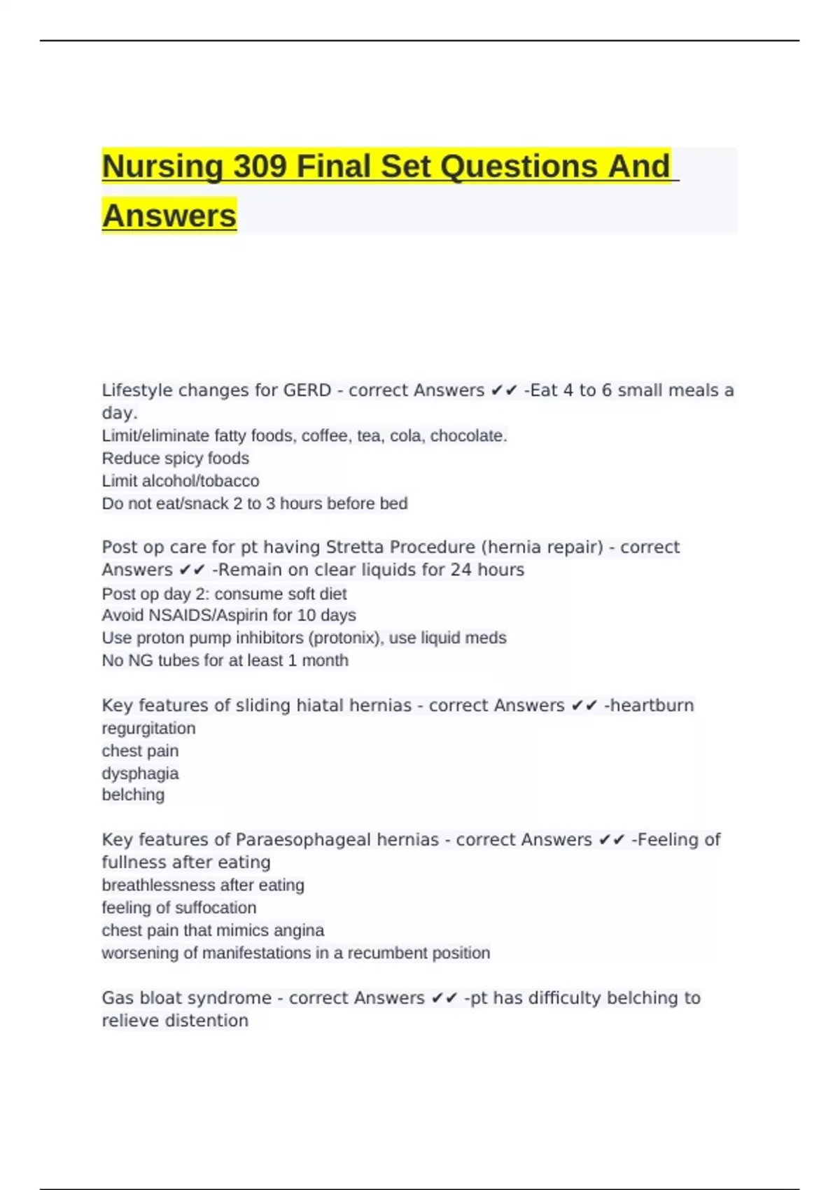 Nursing 309 Final Set Questions And Answers