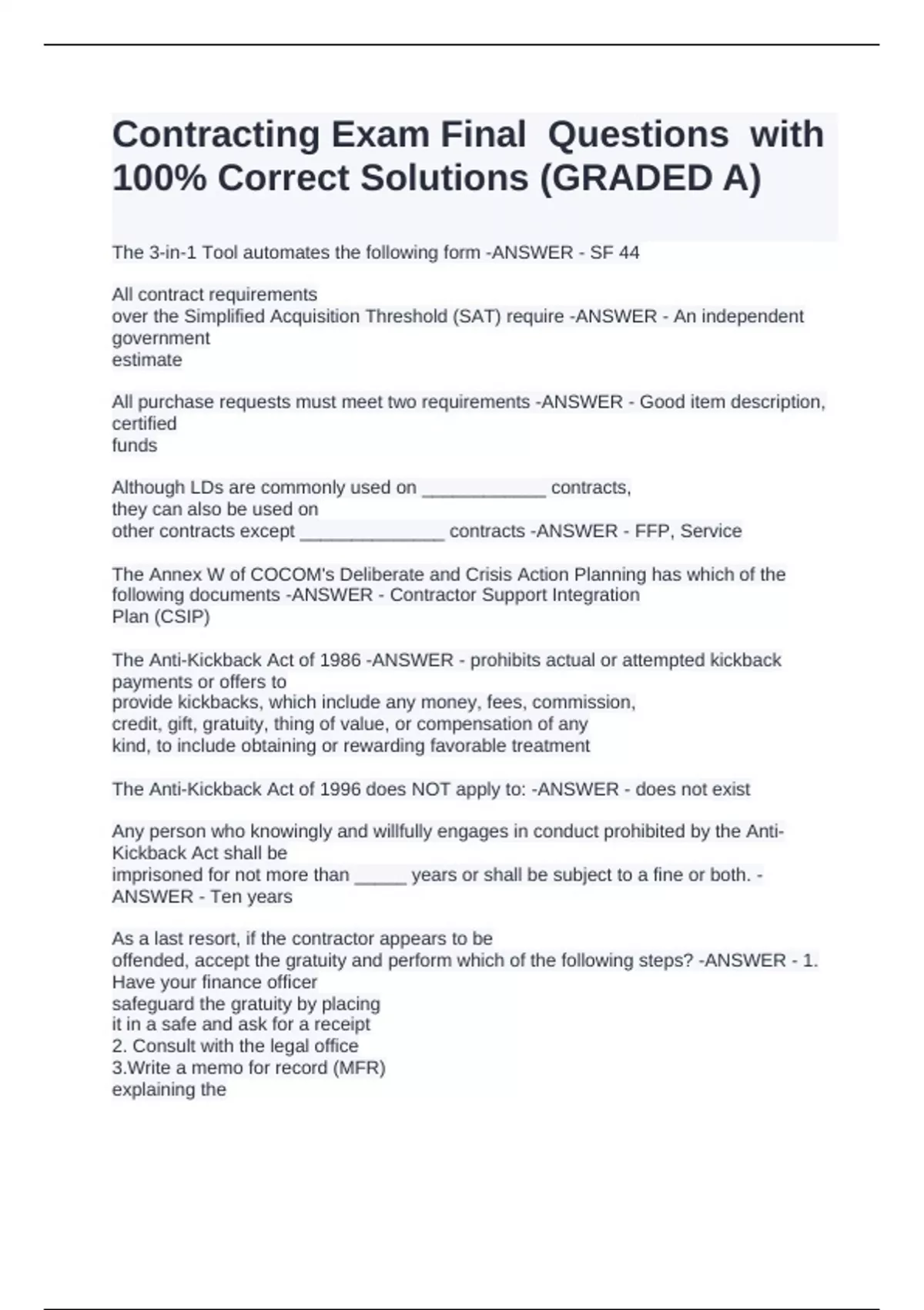 The Anti-Kickback Act of 1986 -ANSWER - prohibits actual or attempted kickback