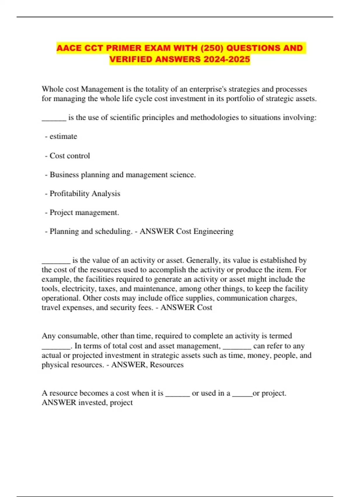 AACE CCT PRIMER EXAM WITH (250) QUESTIONS AND