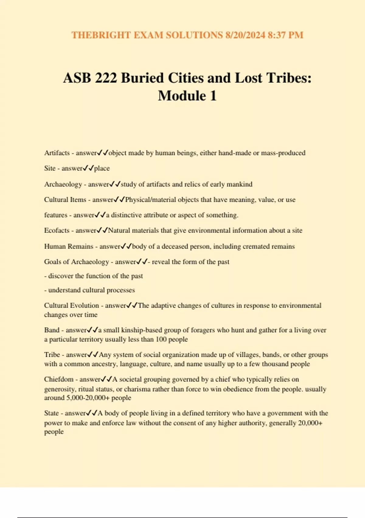 ASB 222 Buried Cities and Lost Tribes: Module 1 Artifacts - answerobject made by human beings, either hand-made or mass-produced Site - answerplace Archaeology - answerstudy of artifacts and relics of early mankind Cultural Items - answerPhysical/material objects that have meaning, value, or use features - answera distinctive attribute or aspect of something. Ecofacts - answerNatural materials that give environmental information about a site Human Remains - answerbody of a deceased person, including cremated remains Goals of Archaeology - answer- reveal the form of the past - discover the function of the past - understand cultural processes Cultural Evolution - answerThe adaptive changes of cultures in response to environmental changes over time Band - answera small kinship-based group of foragers who hunt and gather for a living over a particular territory usually less than 100 people Tribe - answerAny system of social organization made up of villages, bands, or other groups with a common ancestry, language, culture, and name usually up to a few thousand people Chiefdom - answerA societal grouping governed by a chief who typically relies on generosity, ritual status, or charisma rather than force to win obedience from the people. usually around 5,000-20,000+ people State - answerA body of people living in a defined territory who have a government with the power to make and enforce law with