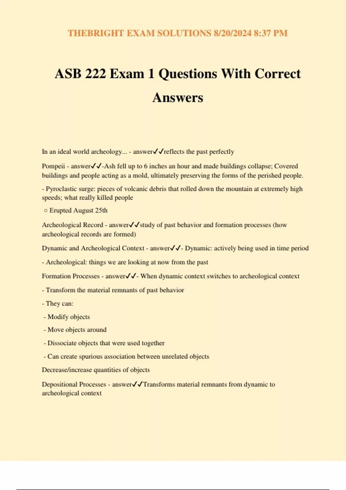 ASB 222 Exam 1 Questions With Correct Answers In an ideal world archeology... - answerreflects the past perfectly Pompeii - answer-Ash fell up to 6 inches an hour and made buildings collapse; Covered buildings and people acting as a mold, ultimately preserving the forms of the perished people. - Pyroclastic surge: pieces of volcanic debris that rolled down the mountain at extremely high speeds; what really killed people ○ Erupted August 25th Archeological Record - answerstudy of past behavior and formation processes (how archeological records are formed) Dynamic and Archeological Context - answer- Dynamic: actively being used in time period - Archeological: things we are looking at now from the past Formation Processes - answer- When dynamic context switches to archeological context - Transform the material remnants of past behavior - They can: - Modify objects - Move objects around - Dissociate objects that were used together - Can create spurious association between unrelated objects Decrease/increase quantities of objects Depositional Processes - answerTransforms material remnants from dynamic to archeological context THEBRIGHT EXAM SOLUTIONS 8/20/2024 8:37 PM Cultural Disturbance processes - answerChange the materials within the archeological record itself - EX: looting Preservation Processes - answerAffect the survival of material remains in archeological context Natural Disturbance Processes - answerChange the materials within the archeological record itself Archeological Data - answer- Minimal: - Artifacts: are cultural, moveable objects - Ecofacts: plant or animal remains - Features: are non-portable object modified; in whole or in part; by human activity - Composite: - Burial: are features that contain human (or animal) remains. Sometimes associated with artifacts - Sites: are places where artifacts, ecofacts, or features have been found Thomas Jefferson - answer○ brought American archeology into more of a profession ○ Conducted the first archeological expedition ○ Grave Creek Mound, West Virginia = in his backyard; decided to build a trench across it; found that the mounds were actually burials from NA tribes Paleontologists - answer○ study dinosaurs not archeologists ○ Is the study of past life, and uses its source info from fossil records Archeology - answer○ is the study of the human past through the study of material culture ○ Starts 2.6 million years ago when materials start to appear (archeological record) ○ Both history and science § History tends to focus on a particular part of the past Science tends to focus on the regularities across a class of events History - answer○ is the study of the human past using written records (books, maps, etc.) ○ Starts close to present, about 5.4