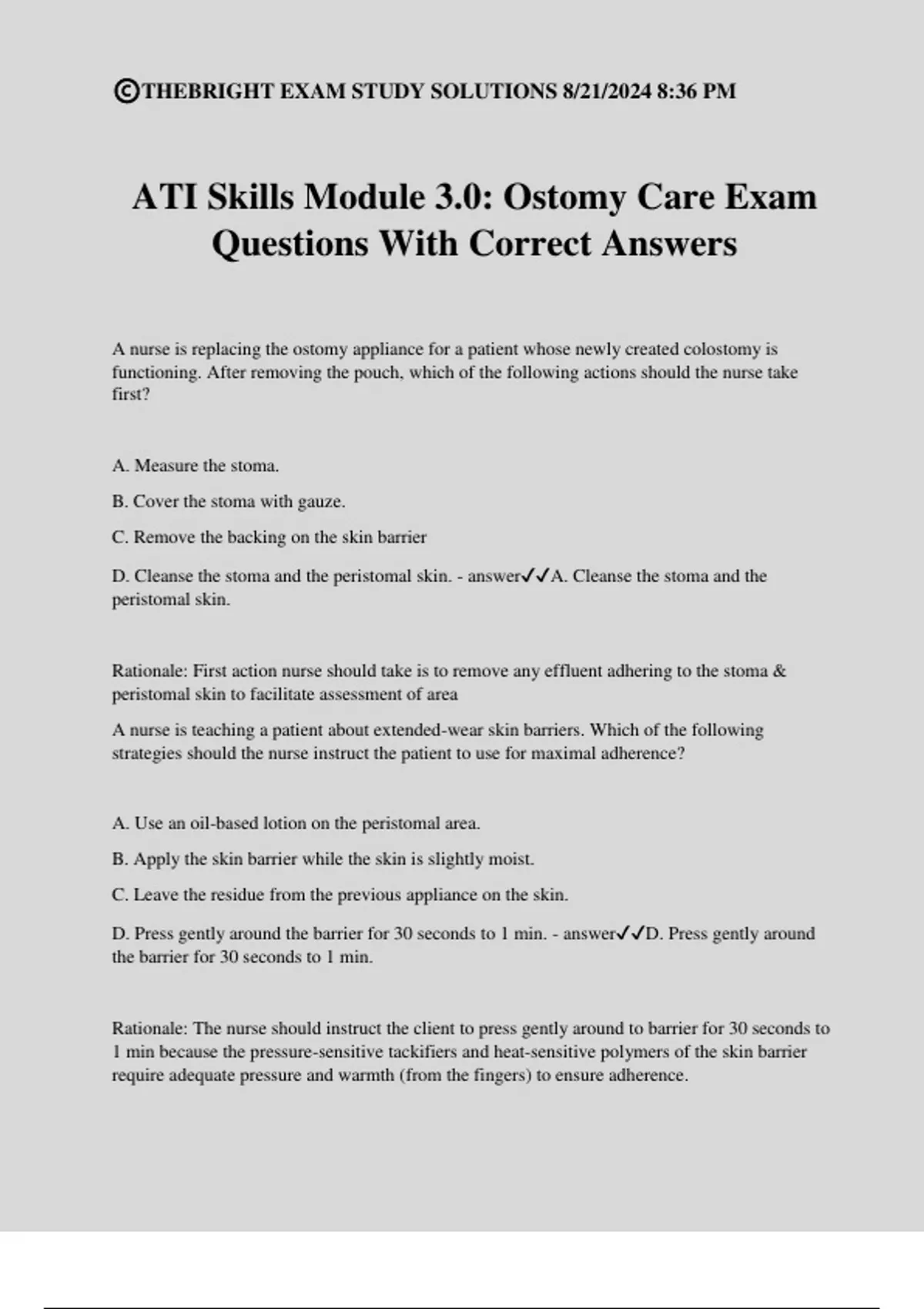 ATI Skills Module 3.0: Ostomy Care Exam Questions With Correct Answers A nurse is replacing the ostomy appliance for a patient whose newly created colostomy is functioning. After removing the pouch, which of the following actions should the nurse take first? A. Measure the stoma. B. Cover the stoma with gauze. C. Remove the backing on the skin barrier D. Cleanse the stoma and the peristomal skin. - answerA. Cleanse the stoma and the peristomal skin. Rationale: First action nurse should take is to remove any effluent adhering to the stoma & peristomal skin to facilitate assessment of area A nurse is teaching a patient about extended-wear skin barriers. Which of the following strategies should the nurse instruct the patient to use for maximal adherence? A. Use an oil-based lotion on the peristomal area. B. Apply the skin barrier while the skin is slightly moist. C. Leave the residue from the previous appliance on the skin. D. Press gently around the barrier for 30 seconds to 1 min. - answerD. Press gently around the barrier for 30 seconds to 1 min. Rationale: The nurse should instruct the client to press gently around to barrier for 30 seconds to 1 min because the pressure-sensitive tackifiers and heat-sensitive polymers of the skin barrier require adequate pressure and