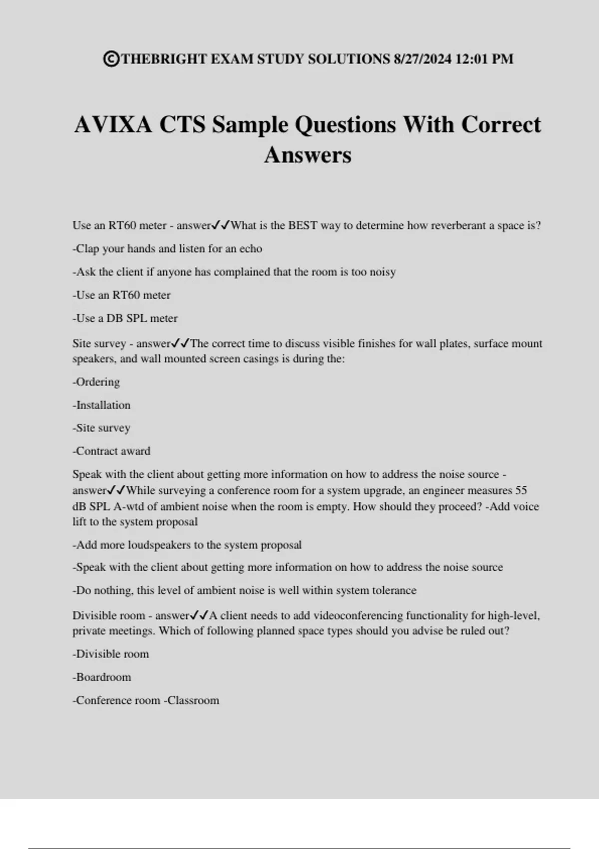 AVIXA CTS Sample Questions With Correct Answers Use an RT60 meter - answerWhat is the BEST way to determine how reverberant a space is? -Clap your hands and listen for an echo -Ask the client if anyone has complained that the room is too noisy -Use an RT60 meter -Use a DB SPL meter Site survey - answerThe correct time to discuss visible finishes for wall plates, surface mount speakers, and wall mounted screen casings is during the: -Ordering -Installation -Site survey -Contract award Speak with the client about getting more information on how to address the noise source - answerWhile surveying a conference room for a system upgrade, an engineer measures 55 dB SPL A-wtd of ambient noise when the room is empty. How should they proceed? -Add voice lift to the system proposal -Add more loudspeakers to the system proposal -Speak with the client about getting more information on how to address the noise source -Do nothing, this level of ambient noise is well within system tolerance Divisible room - answerA client needs to add videoconferencing functionality for high-level, private meetings. Which of following planned space types should you advise be ruled out? -Divisible room -Boardroom -Conference room -Classroom ©THEBRIGHT EXAM STUDY SOLUTIONS 8/27/2024 12:01 PM The Design Phase - answerWhich phase of an AV project comes immediately AFTER the Program Phase? -The Design Phase -Project Planning and Coordination Phase -The Verification Phase -The Documentation Phase Detailed list of equipment - answerWhich is NOT presented in the program report: - Executive Summary -Detailed list of equipment -Budgets -Infrastructure Considerations An overview of the programming process including who was surveyed during the process. - answerWhen preparing an executive summary what should be included for submittal to the client? -A deep dive, including full technical specficiation, of all equipment to be used in the design. -An estimation of how many change orders might be required if the client doesn't use your design. -References to new and emerging technologies that should be considered for future spaces. -An overview of the programming process including who was surveyed during the process. Additive color system - answerWhich system is used to show colors from a video display? -Additive color system -Subtractive color system -Plus/minus color system -Recover color system 25 db - answerAn installed audio system should be AT LEAST __________ above the ambient noise floor. -5 dB -25 dB -45 dB -75 dB RS-232 - answerA device is controlled using the pictured cable. What is the MOST LIKELY method of controlling this devi