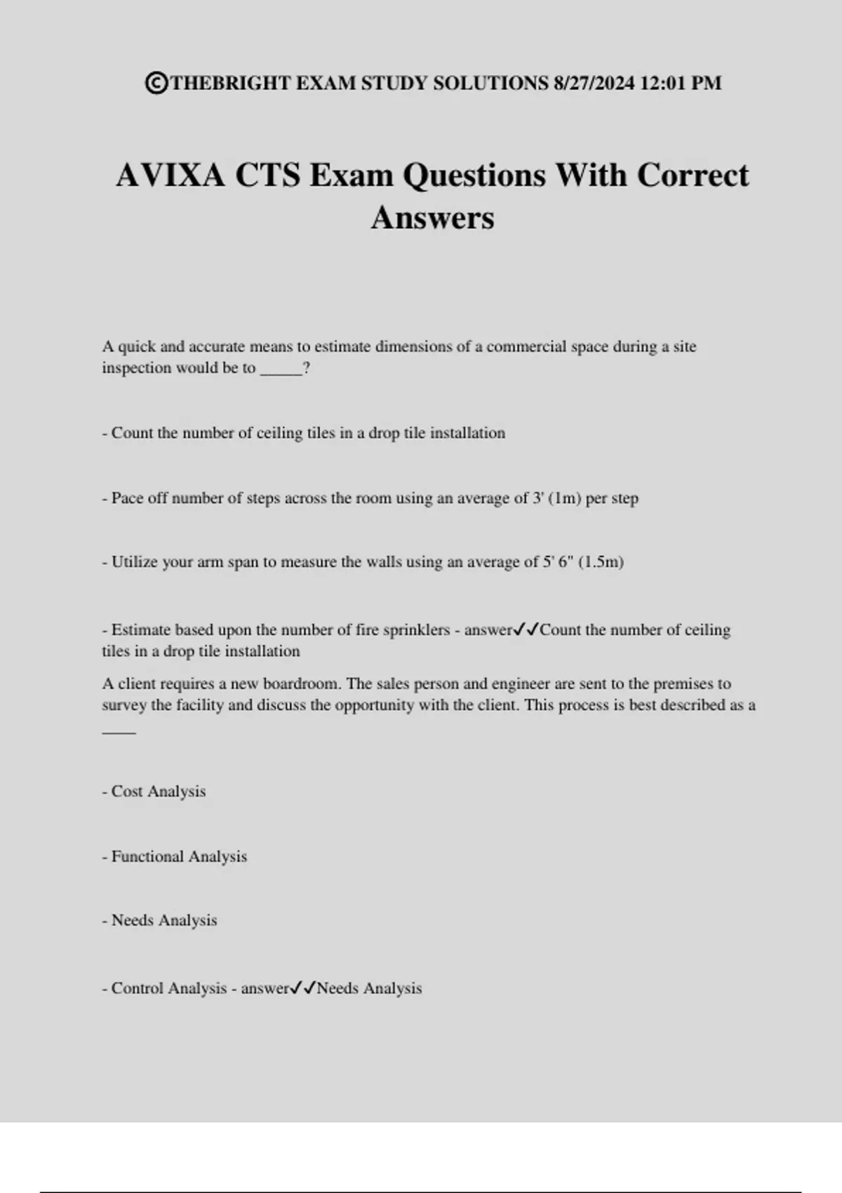AVIXA CTS Exam Questions With Correct Answers A quick and accurate means to estimate dimensions of a commercial space during a site inspection would be to _____? - Count the number of ceiling tiles in a drop tile installation - Pace off number of steps across the room using an average of 3' (1m) per step - Utilize your arm span to measure the walls using an average of 5' 6" (1.5m) - Estimate based upon the number of fire sprinklers - answerCount the number of ceiling tiles in a drop tile installation A client requires a new boardroom. The sales person and engineer are sent to the premises to survey the facility and discuss the opportunity with the client. This process is best described as a ____ - Cost Analysis - Functional Analysis - Needs Analysis - Control Analysis - answerNeeds Analysis ©THEBRIGHT EXAM STUDY SOLUTIONS 8/27/2024 12:01 PM When designing a client's new training room, the MOST important information would come from the - client's checklist of preferred equipment - end-user descriptions of how the room will be utilized - architectural drawings of the building - feedback from the benchmarking site visit - answerend-user descriptions of how the room will be utilized When establishing initial contact with a client, try to develop a relationship early on with the: - Chief operating officer - Information technology manager - Stakeholders - Purchasing manager - answerStakeholders When creating an AV solution for a client, the first step should be - creating a quote - Proposing a technology - reviewing existing infrastructure ©THEBRIGHT EXAM STUDY SOLUTIONS 8/27/2024 12:01 PM - Gathering application requirements - answerGathering application requirements AV professionals determine the end user's needs by examining three things: the required applications, the tasks, and the: - Overall design concept - Budget - Technologies - Functions to support the applications - answerFunctions to support the applications What is the BEST way to determine how reverberant a space is? - Clap your hands and listen for an echo - Ask the client if anyone has complained that the room is too noisy - Use an RT60 meter - Use a DB SPL meter - answerUse an RT60 meter __ is the process of examining methods, techniques, and principles from peer organizations and facilities. - Schematic Design - Punching a system - Benchmarking -Schematic Design - answerBenchmarking When working with a client what should be AVOIDED to ensure that you are communicating effectively? - Using diagrams and drawings as a reference - Industry slang terms and jargon - Plain language ©THEBRIGHT EXAM STUDY SOLUTIONS 8/27/2024 12:01 PM - Demonstrating abstract concepts with real life examples - answerIndustry slang terms and jargon Prior to conducting a needs analysis for a new project, a coworker tells the AV designer what equipment package they know will work. What should the designer do with this information? - Contact the client about the equipment package. - Price out the equipment package to present to the client. - Setup a demonstration to show the functionality of the equipment package. - Thank the coworker for their input, remind them that you still need to conduct a needs analysis. - answerThank the coworker for their input, remind them that you still need to conduct a needs analysis. The correct time to discuss vi