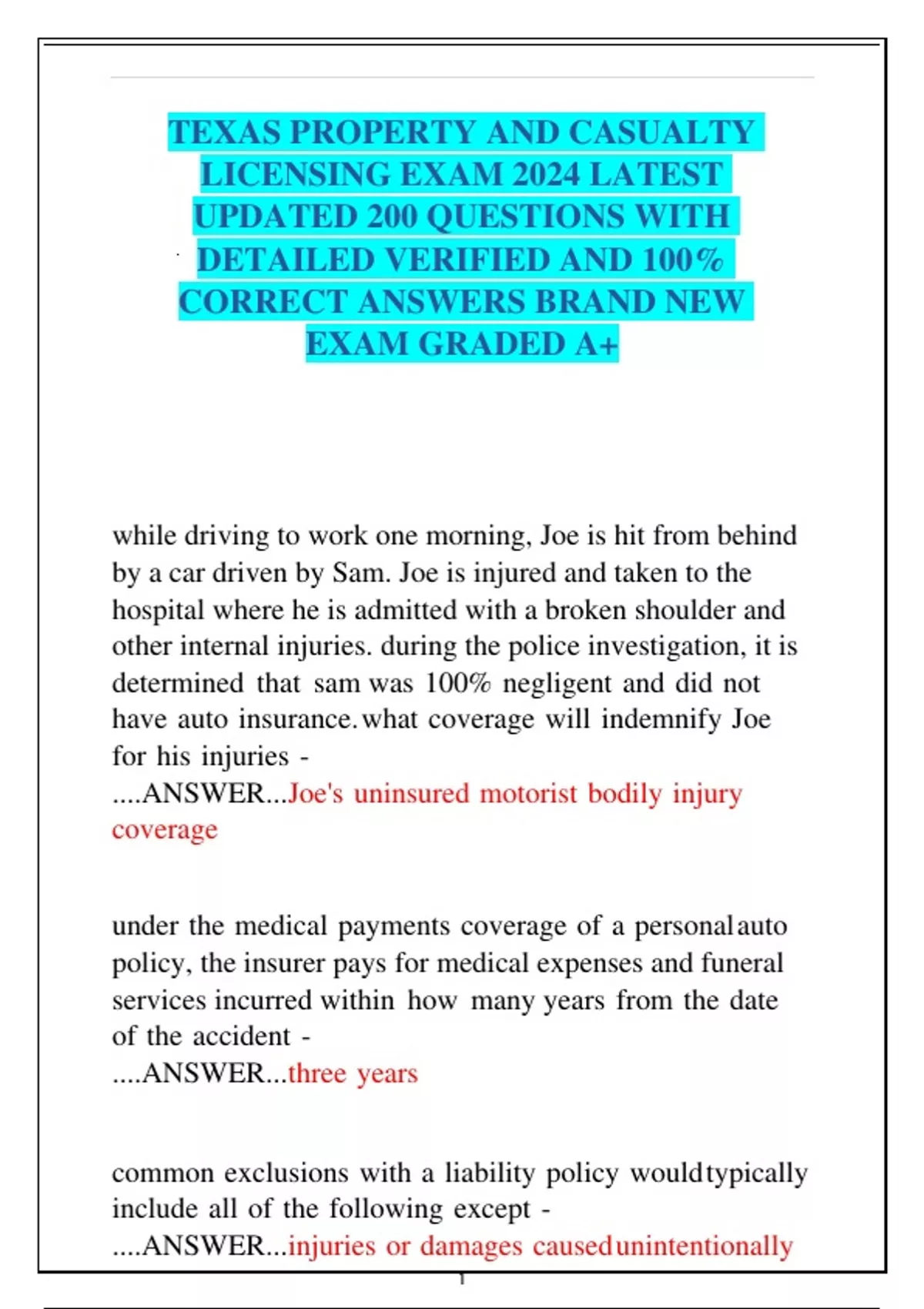 TEXAS PROPERTY AND CASUALTY LICENSING EXAM 2024 LATEST UPDATED 200 QUESTIONS WITH DETAILED VERIFIED AND 100% CORRECT ANSWERS BRAND NEW EXAM GRADED A+