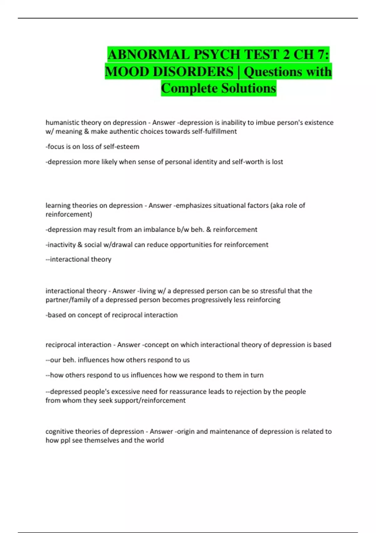 ABNORMAL PSYCH TEST 2 CH 7: MOOD DISORDERS | Questions with Complete Solutions