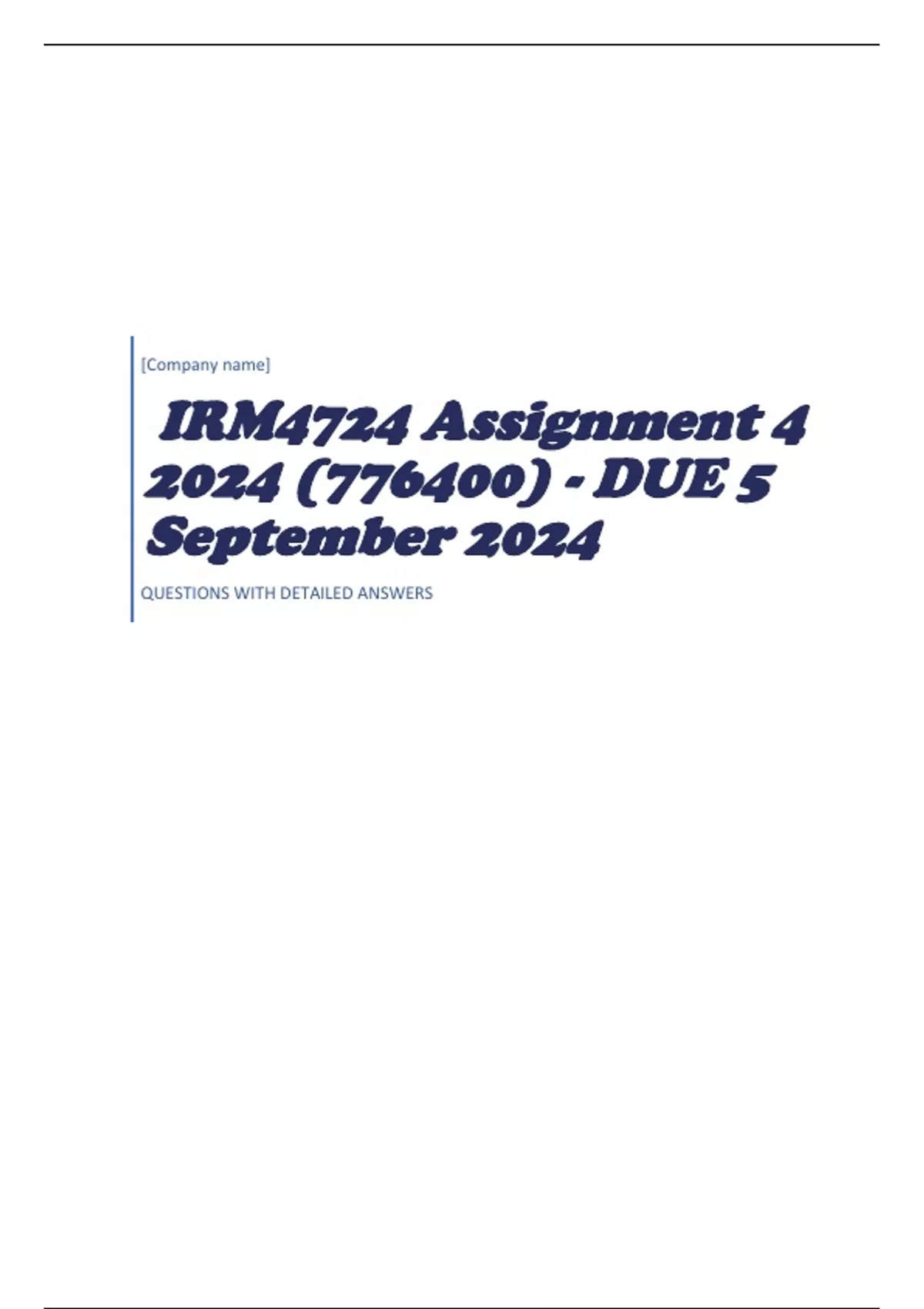 IRM4724 Assignment 4 2024 (776400) - DUE 5 September 2024 QUESTIONS WITH COMPLETE ANSWERS