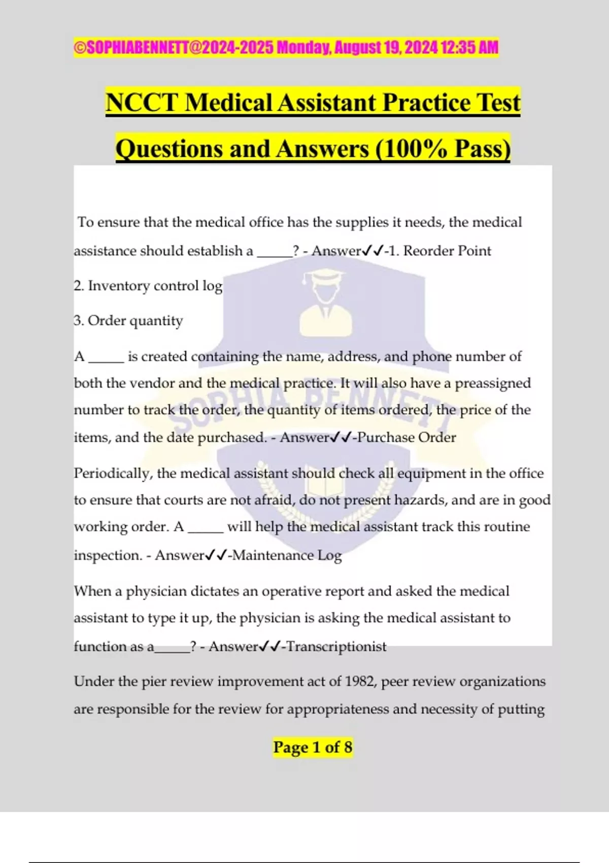 NCCT Medical Assistant Practice Test Questions and Answers (100% Pass) To ensure that the medical office has the supplies it needs, the medical assistance should establish a _____? - Answer️️ -1. Reorder Point 2. Inventory control log 3. Order quantity A _____ is created containing the name, address, and phone number of both the vendor and the medical practice. It will also have a preassigned number to track the order, the quantity of items ordered, the price of the items, and the date purchased. - Answer️️ -Purchase Order Periodically, the medical assistant should check all equipment in the office to ensure that courts are not afraid, do not present hazards, and are in good working order. A _____ will help the medical assistant track this routine inspection. - Answer️️ -Maintenance Log When a physician dictates an operative report and asked the medical assistant to type it up, the physician is asking the medical assistant to function as a_____? - Answer️️ -Transcriptionist Under the pier review improvement act of 1982, peer review organizations are responsible for the review for appropriateness and necessity of putting ©SOPHIABENNETT@ Monday, August 19, 2024 12:35 AM Page 2 of 8 a patient into the hospital by a process known as _____ review - Answer️️ -Admissions Which one of the following is a decision based upon bioethics. a. Reporting physical, emotional, or mental abuse. b. Treating a 16 year old girl who is pregnant without parental consent. c. The use of fetal tissue transplantation for research. d. Reporting to the authorities a suicidal patient. - Answer️️ -The use of fetal tissue transplantation for research. A physician must have the patient's permission in writing to reveal any confidential information except for which of the following? gunshot wound, anorexia, drug addiction, pregnancy - Answer️️ -Gunshot Wound what is the federal regulation that requires healthcare professionals to protect the privacy and confidentiality of patients health information? - Answer️️ -HIPPA a business letter, written in full block style will have all lines_____? - Answer️️ -At the left hand margin. when writing a business letter, the salutation of a letter should be followed by which punctuation mark? - Answer️️ -Colon : when handling a patient complaint, which one of the following would be most appropriate? ©SOPHIABENNETT@ Monday, August 19, 2024 12:35 AM Page 3 of 8 a. If the patient is angry, matches/her anger level, and she will calm down. b. take all complaints seriously and take thorough notes c. refused to talk to patients who are complaining; the doctor should handle them. d. no correct answer - Answer️️ -b. take all complaints seriously and take thorough notes body language, body posture, space and distance are all examples of _____? - Answer️️ -nonverbal communication what is the suggested procedure for canceling an appointment in the appointment book? - Answer️️ -Mark through the entry with a single red line the amount an insured patient must pay towards claims each year for the insurance company will pay for medical treatmen