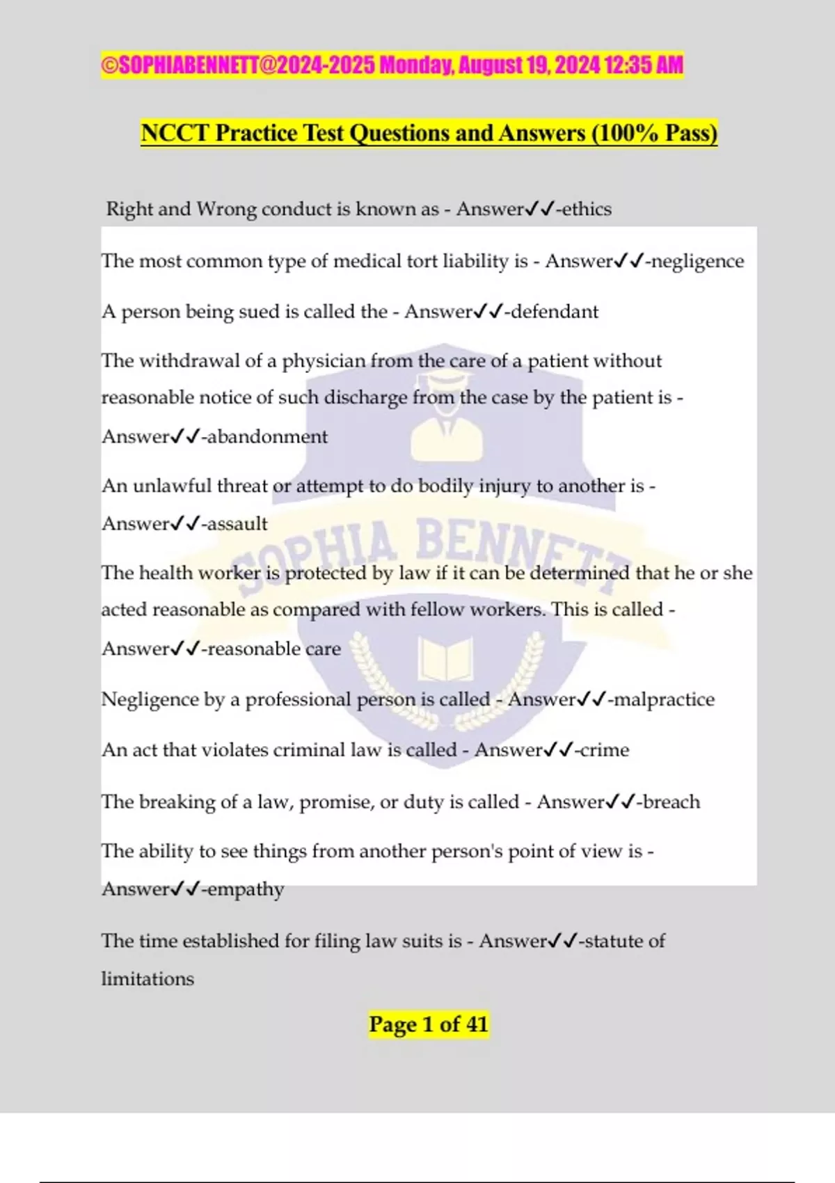 NCCT Practice Test Questions and Answers (100% Pass) Right and Wrong conduct is known as - Answer️️ -ethics The most common type of medical tort liability is - Answer️️ -negligence A person being sued is called the - Answer️️ -defendant The withdrawal of a physician from the care of a patient without reasonable notice of such discharge from the case by the patient is - Answer️️ -abandonment An unlawful threat or attempt to do bodily injury to another is - Answer️️ -assault The health worker is protected by law if it can be determined that he or she acted reasonable as compared with fellow workers. This is called - Answer️️ -reasonable care Negligence by a professional person is called - Answer️️ -malpractice An act that violates criminal law is called - Answer️️ -crime The breaking of a law, promise, or duty is called - Answer️️ -breach The ability to see things from another person's point of view is - Answer️️ -empathy The time established for filing law suits is - Answer️️ -statute of limitations ©SOPHIABENNETT@ Monday, August 19, 2024 12:35 AM Page 2 of 41 A writ that commands a witness to appear at a trial or other proceeding and to give testimony is a - Answer️️ -subpoena A wrong committed against another person or the person's property is a - Answer️️ -tort Holding or detaining a person against his will is - Answer️️ -false imprisonment A violation of a person's right not to have his or her name, photograph, or private affairs exposed of made public without giving consent is - Answer️️ -invasion of privacy A major crime for which greater punishment is imposed other than a misdemeanor is - Answer️️ -felony One who institutes a lawsuit is - Answer️️ -plaintiff A legal statement of how an individual's property is to be distributed after death is - Answer️️ -will Information given by a patient to medical personnel which cannot be disclosed without consent of the person who gave it is - Answer️️ - privileged communication A rule of conduct made by a government body is - Answer️️ -law Failure to do something that a reasonable person would do under ordinary circumstances that ends up causing harm to another person or a person's property is - Answer️️ -negligence ©SOPHIABENNETT@ Monday, August 19, 2024 12:35 AM Page 3 of 41 Permission granted by a person voluntarily and in his right mind is - Answer️️ -consent Injuring the name and reputation of another person by making false statements to a third person is - Answer️️ -defamation An agreement between two or more parties for the doing or not doing of some definite thing is - Answer️️ -contract Lack of physical or mental fitness is known as - Answer️️ -incompetence The final decision of a court in an action or suit is - Answer️️ -judgment Responsibility of an employer for the acts of an employee is - Answer️️ - libel A Latin term signifying that a person is not of sound mind is - Answer️️ - non compos mentis A person who is no longer under the care, custody, or supervision of a parent is called - Answer️️ -emancipated minor An impartial panel established to listen to and investigate patient's complaints about medical care of excessive fees is called a what committee - Answer️️ -medical grievance Latin for "things done; deeds", the facts and circumstances attendant to the act in question would be called - Answer️️ -res gestae Testimony of a witness under oath and written down before trial for possible use when the case comes to trial is - Answer️️ -deposition ©SOPHIABENNETT@ Monday, August 19, 2024 12:35 AM Page 4 of 41 A statute that enforces private right and liabilities, as differentiated from criminal law is called a - Answer️️ -civil law Violation or omission of a legal or moral duty is called - Answer️️ -breach of duty A deliberate physical attack upon a person is called - Answer️️ -battery Latin for "he who acts through another acts for himself: is called - Answer️️ -qui facit per alium facit per se The branch of study of moral issues, questions, and problems arising in the practice of medicine and in biomedical research is called - Answer️️ - bioethics A statement given concerning some scientific, technical, or professional matter by an expert, such as physician is called - Answer️️ -expert testimony A patient's failure to act prudently and reasonably, or doing that which a reasonable person would not do under similar circumstances in called - Answer️️ -contributory negligence Consent to treatment based on a full understanding of all possible risks of unpreventable results of that treatment is called - Answer️️ -assumptio