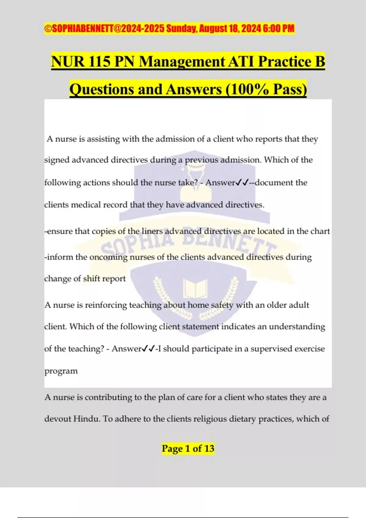 NUR 115 PN Management ATI Practice B Questions and Answers (100% Pass) A nurse is assisting with the admission of a client who reports that they signed advanced directives during a previous admission. Which of the following actions should the nurse take? - Answer️️ --document the clients medical record that they have advanced directives. -ensure that copies of the liners advanced directives are located in the chart -inform the oncoming nurses of the clients advanced directives during change of shift report A nurse is reinforcing teaching about home safety with an older adult client. Which of the following client statement indicates an understanding of the teaching? - Answer️️ -I should participate in a supervised exercise program A nurse is contributing to the plan of care for a client who states they are a devout Hindu. To adhere to the clients religious dietary practices, which of ©SOPHIABENNETT@ Sunday, August 18, 2024 6:00 PM Page 2 of 13 the following food option should the nurse offer to the client? - Answer️️ -Yogurt A charge nurse is asked by two staff nurses to assist in resolving a conflict about holiday scheduling. Which of the following actions should the charge nurse take? - Answer️️ -Encourage each staff nurse to give up something as part of the negotiation. A charge nurse is discussing legal issues with a newly licensed nurse. Which of the following actions should the charge nurse identify as professional negligence? - Answer️️ -Failing to provide one-to-one observation for a client who is suicidal. A nurse is collecting data from a client following abdominal surgery. The nurse should identify that which of the following findings is the priority to report to the provider? - Answer️️ -Surgical dressing saturated with bloody drainage A nurse is assisting with the care of an older adult client who is recovering from a stroke and is experiencing difficulty swallowing in performing ADLs. The client will be living with their adult child following discharge. ©SOPHIABENNETT@ Sunday, August 18, 2024 6:00 PM Page 3 of 13 The nurse should recognize that which of the following client referral has the highest priority? - Answer️️ -Speech therapy A nurse realize they have administered the wrong medication to a client. Which of the following actions should the nurse take first? - Answer️️ - Monitor the clients vital signs A nurse at a rehabilitation facility is participating in an inter-professional care conference for a client who is one week post operative following and above the knee amputation. Which of the following findings is the priority for the nurse to report at the conference? - Answer️️ -The clients incision site has purulent drainage A nurse is completing documentation on the computer at the nurses station one in assistive personnel request to use the computer to enter morning vital signs. Which of the following actions should the nurse take? - Answer️️ -Ask the AP to find another computer A nurse in a long-term care facility is caring for a client who is refusing their prescribed medication. Which of the following actions should the ©SOPHIABENNETT@ Sunday, August 18, 2024 6:00 PM Page 4 of 13 nurse take first? - Answer️️ -Identify the clients concerns about taking the medications A nurse in a long-term care facility is preparing to demonstrate administration of a cleansing enema to a group of newly licensed nurses. Which of the following actions should the nurse plan to take during the demonstration? - Answer️️ -Place the client in the left side lying position A newly licensed nurse is caring for a client who requires a straight catheterization. The nurse informed the charge nurse that they have only observed the procedure on two occasions. Which of the following responsive to the charge nurse make? - Answer️️ -Let's discuss the procedure and I will assist you with it the first time A nurse is assisting with a presentation about preparing a home disaster supply kit at a community health fair. Which of the following statements by a participant indicates an understanding of the information? - Answer️️ -I will purchase canned fruit for the kit A nurse is observing an assistive personnel provide care for a group of clients. The nurse should intervene when the AP dons g