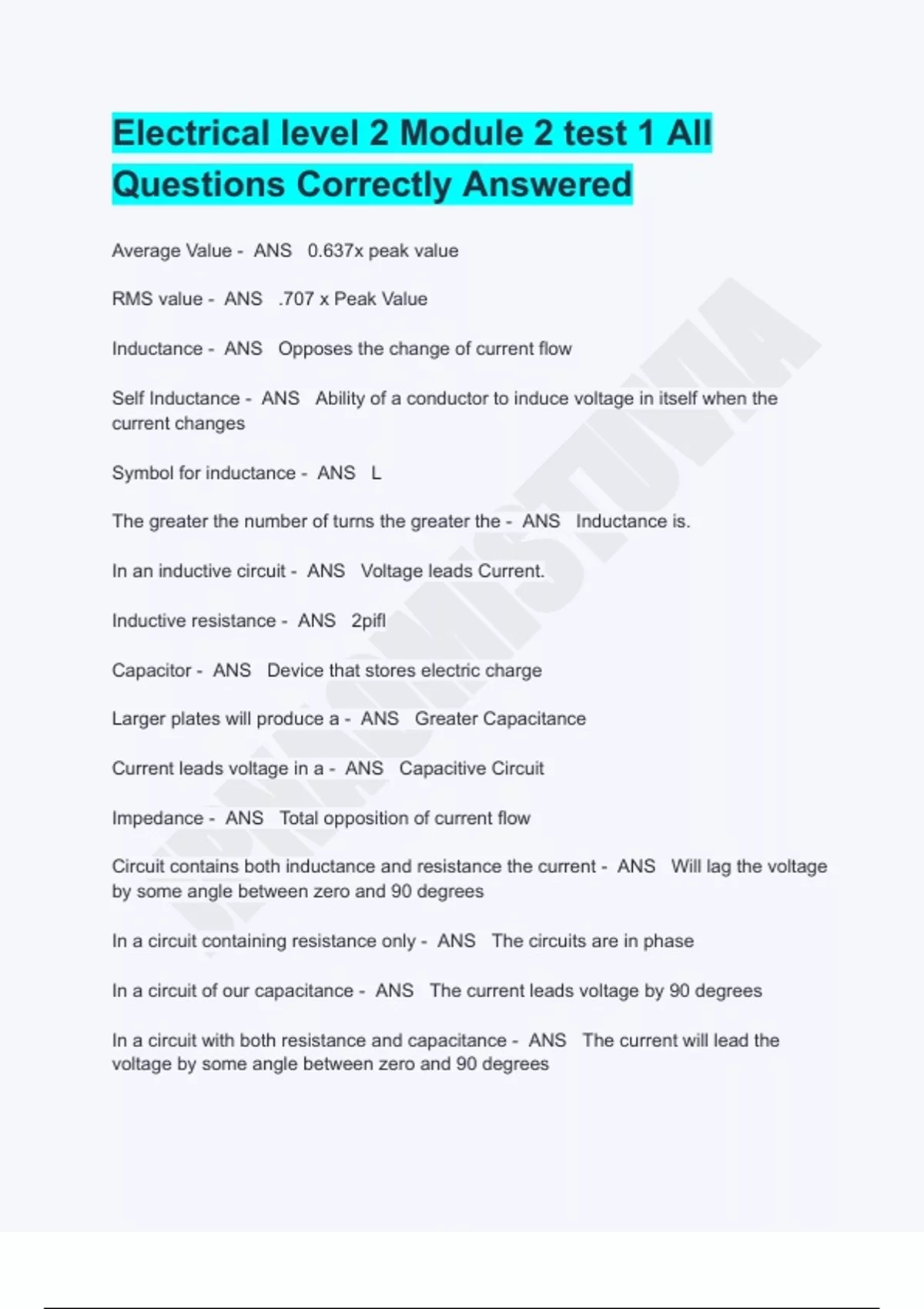 Electrical level 2 Module 2 test 1 All Questions Correctly Answered Average Value - ANS 0.637x peak value RMS value - ANS .707 x Peak Value Inductance - ANS Opposes the change of current flow Self Inductance - ANS Ability of a conductor to induce voltage in itself when the current changes Symbol for inductance - ANS L The greater the number of turns the greater the - ANS Inductance is. In an inductive circuit - ANS Voltage leads Current. Inductive resistance - ANS 2pifl Capacitor - ANS Device that stores electric charge Larger plates will produce a - ANS Greater Capacitance Current leads voltage in a - ANS Capacitive Circuit