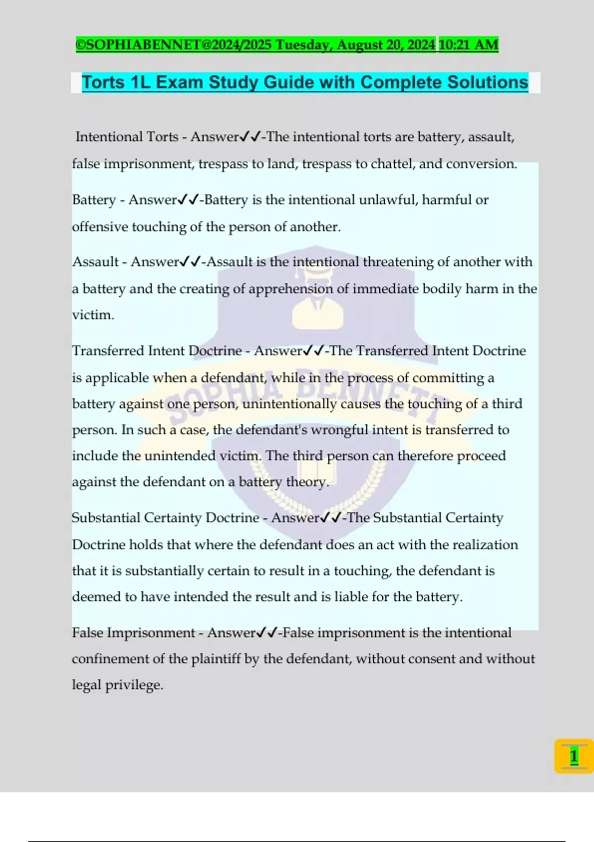 Torts 1L Exam Study Guide with Complete Solutions Intentional Torts - Answer️️ -The intentional torts are battery, assault, false imprisonment, trespass to land, trespass to chattel, and conversion. Battery - Answer️️ -Battery is the intentional unlawful, harmful or offensive touching of the person of another. Assault - Answer️️ -Assault is the intentional threatening of another with a battery and the creating of apprehension of immediate bodily harm in the victim. Transferred Intent Doctrine - Answer️️ -The Transferred Intent Doctrine is applicable when a defendant, while in the process of committing a battery against one person, unintentionally causes the touching of a third person. In such a case, the defendant's wrongful intent is transferred to include the unintended victim. The third person can therefore proceed against the defendant on a battery theory. Substantial Certainty Doctrine - Answer️️ -The Substantial Certainty Doctrine holds that where the defendant does an act with the realization that it is substantially certain to result in a touching, the defendant is deemed to have intended the result and is liable for the battery. False Imprisonment - Answer️️ -False imprisonment is the intentional confinement of the plaintiff by the defendant, without consent and without legal privilege. ©SOPHIABENNET@2024/2025 Tuesday, August 20, 2024 10:21 AM 2 Trespass to Land - Answer️️ -Trespass to land is an entry upon land in the possession of another, without consent and without legal privilege. Trespass to Chattel - Answer️️ -Trespass to chattel is the intentional taking or damaging of personal property in the possession of another, without consent and without legal privilege. Conversion - Answer️️ -Conversion is an intentional assumption of dominion and control over the personal property of another resulting in a substantial interference with the plaintiff's possessory rights, without consent and without legal privilege. Trespass Ab Initio - Answer️️ -Trespass ab initio is an entry upon the land in possession of another under a conferred legal right, and the subsequent abusing of that conferred legal right through the commission of an assault, battery, false imprisonment, or trespass. Private Nuisance - Answer️️ -A private nuisance results from an act or conduct by the defendant which unreasonably interferes with the plaintiff's use and enjoyment of his or her property. Public Nuisance - Answer️️ -Public nuisance results from an act or conduct by the defendant which is injurious to the public in general. Defenses to Intentional Torts - Answer️️ -Defenses to intentional torts are consent, self-defense, defense of others, defense of property, prevention of crime, recovery of property, legal authority, and necessity. ©SOPHIABENNET@2024/2025 Tuesday, August 20, 2024 10:21 AM 3 Consent - Answer️️ -Consent relates to the plaintiff's state of mind and the existence of express or implied willingness that the defendant should act in the complained of manner. The Defense of Self-Defense - Answer️️ -Self-defense is a defense that relates to the general proposition that a person who reasonably believes himself to be threatened with immediate bodily harm may use whatever degree of force is apparently necessary to protect himself or herself. The Defense of Defense of Others - Answer️️ -The defense of others relates to the general proposition that a person who reasonably