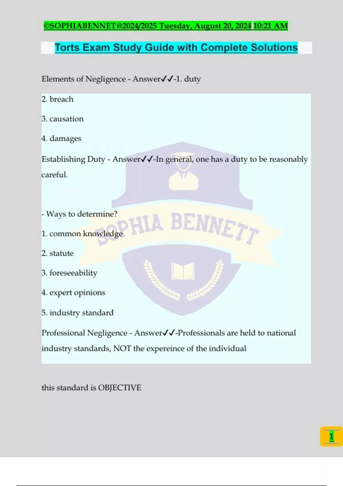 Torts Exam Study Guide with Complete Solutions Elements of Negligence - Answer️️ -1. duty 2. breach 3. causation 4. damages Establishing Duty - Answer️️ -In general, one has a duty to be reasonably careful. - Ways to determine? 1. common knowledge 2. statute 3. foreseeability 4. expert opinions 5. industry standard Professional Negligence - Answer️️ -Professionals are held to national industry standards, NOT the expereince of the individual this standard is OBJECTIVE ©SOPHIABENNET@2024/2025 Tuesday, August 20, 2024 10:21 AM 2 ex: "Reasonably prudent pilot" NOT "a pilot with JFK's experience" Breach - Answer️️ -duty is where we set the bar, breach is if you are over or under that bar of standard of care owed to another caustation - Answer️️ -asks "did the breach cause the damages?" must satisfy both cause in fact AND proximate cause causation in fact - Answer️️ -"but for" causation If "but for" doesn't work, the actor's negligence must have been a SUBSTANTIAL FACTOR in contributing to the harm (2 fires case) must be more than remote or trivial relationship to harm done does not have to be the only cause proving causation in fact - Answer️️ -- must prove by preponderance of the evidence - burden of proof rests on plaintiff proximate cause - Answer️️ -The harm done is a natural and probable consequence of the negligent action must be close in time and space - cannot be too attenuated with too many intervening variables Palsgraf Rule - Answer️️ -Zone of danger rule ©SOPHIABENNET@2024/2025 Tuesday, August 20, 2024 10:21 AM 3 - freeze time right before harm occurs - who would you expect to be injured by the negligent action? - this is whats "forseeable" in determining proximate cause Polemis Rule - Answer️️ -Severity of damage does not matter - actor is liable for ANY harm that occurs from a forseeably negligent act - ex: when the movers negligently dropped the plank, it was forseeable that someone would get hurt/some damage would occur. The fact that nobody could have forseen the whole ship burning down does not matter. Exceptions to Causation - Answer️️ -1. Dual Cause 2. Substantial Factor 3. Loss of Chance 4. Joint and Several Liability 5. Marketplace Liability loss of chance doctrine - Answer️️ -When a physician negligently misdiagnoses a potentially fatal disease and thereby reduces the patient's chance of survivial, but the patient's chance of recovery was less than 50% even prior to the misdiagnosis, plaintiff ordinarily cannot prove that but for the physician's negligence the plaintiff's death wouldn't have happened. ©SOPHIABENNET@2024/2025 Tuesday, August 20, 2024 10:21 AM 4 TWO VIEWS: STATES DIFFER 1. If a Doctor's negligence reduces P's chance of survival, regardless of original chance, Doctor negligent 2. If patient is below 50% chance of living, and then doctor reduces these odds further, plaintiff cannot recover Eggshell Rule - Answer️️ -The defendant takes the plaintiff as they find him - can be held liable for ALL injuries regardless of any conditions