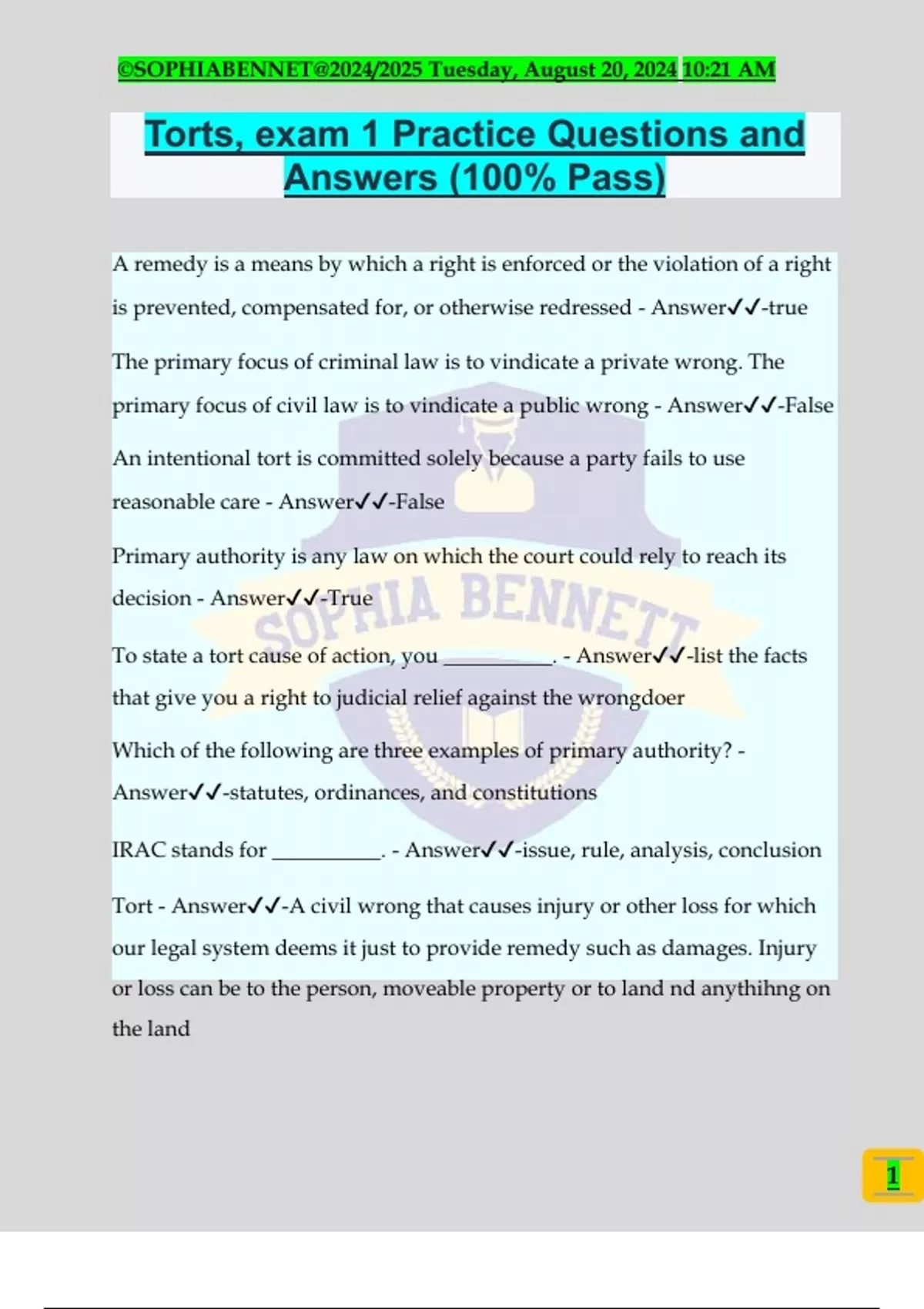 Torts, exam 1 Practice Questions and