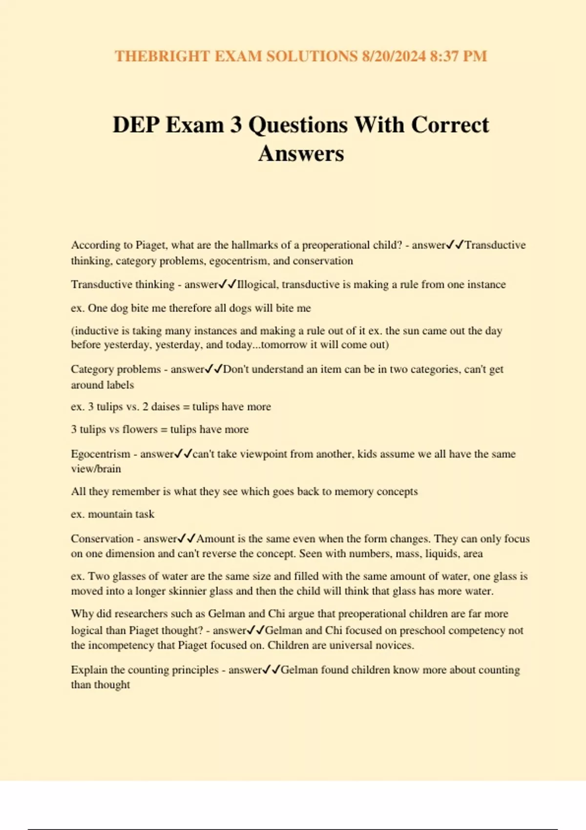 DEP Exam 3 Questions With Correct Answers According to Piaget, what are the hallmarks of a preoperational child? - answerTransductive thinking, category problems, egocentrism, and conservation Transductive thinking - answerIllogical, transductive is making a rule from one instance ex. One dog bite me therefore all dogs will bite me (inductive is taking many instances and making a rule out of it ex. the sun came out the day before yesterday, yesterday, and today...tomorrow it will come out) Category problems - answerDon't understand an item can be in two categories, can't get around labels ex. 3 tulips vs. 2 daises = tulips have more 3 tulips vs flowers = tulips have more Egocentrism - answercan't take viewpoint from another, kids assume we all have the same view/brain All they remember is what they see which goes back to memory concepts ex. mountain task Conservation - answerAmount is the same even when the form changes. They can only focus on one dimension and can't reverse the concept. Seen with numbers, mass, liquids, area ex. Two glasses of water are the same size and filled with the same amount of water, one glass is moved into a longer skinnier glass and then the child will think that glass has more water. Why did researchers such as Gelman and Chi argue that preoperational children are far more logical than Piaget thought? - answerGelman and Chi focused on preschool competency not the incompetency that Piaget focused on. Children are universal novices. Explain the counting principles - answerGelman found children know more about counting than thought THEBRIGHT EXAM SOLUTIONS 8/20/2024 8:37 PM -one-on-one: know only to count each item once -stable order: the same set of numbers have an order 1,2,3,4,5 -cardinal: the last # is the set size -order irrelevant: doesn't matter the order you count as long as they are all counted -abstraction: believing anything can be counted like all cars or pieces of sand until they learn one cannot count that Describe the box model - answerinfo goes into sensory memory - through attention can go into short term memory (2-7) - through rehearsal can go into long term memory. What is working memory? - answerThe brief, immediate memory for material that is currently being processed; a portion of working memory also coordinates ongoing mental activities. (short term mem) Working memory concerns immediate processing. Kids usually cant hold on to more than 2 things at once Sorting strategies - answerpoor sorting strategies, sort logically based on self, new + diff. sort every time ex. ask them to sort red, blue, yellow toys in any way they want and instead of sorting by color they sort randomly "blue car goes with red ice cream because I think they're cool" Differences in schema and script from kids to adults - answerkids notice different things than adults do scripts are schema's for an event ex. what should happen on a first date ex. at McDonald's they might only focus on happy meal toy and playground whereas parents focus on the money and food to feed the child Expertise - answerChildren remember more from things they like than things they don't like ex. boy who loved dinosaurs can remember more names of dinosaurs than a child who doesn't (chess example too) Reading ability - answerThey have a set story structure (Once upon a time) the learning to read changes the children to further develop them Strategies - answerChildren have different strategies than adults ex. shopping studies: 4yr have no strategies and no awareness of memory say they can remember a list of groceries but come back with different items 8yr have awareness of memory and know