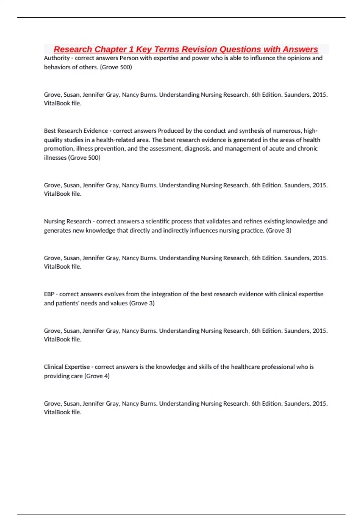 Research Chapter 1 Key Terms Revision Questions with Answers Authority - correct answers Person with expertise and power who is able to influence the opinions and behaviors of others. (Grove 500) Grove, Susan, Jennifer Gray, Nancy Burns. Understanding Nursing Research, 6th Edition. Saunders, 2015. VitalBook file. Best Research Evidence - correct answers Produced by the conduct and synthesis of numerous, high-quality studies in a health-related area. The best research evidence is generated in the areas of health promotion, illness prevention, and the assessment, diagnosis, and management of acute and chronic illnesses (Grove 500) Grove, Susan, Jennifer Gray, Nancy Burns. Understanding Nursing Research, 6th Edition. Saunders, 2015. VitalBook file. Nursing Research - correct answers a scientific process that validates and refines existing knowledge and generates new knowledge that directly and indirectly influences nursing practice. (Grove 3) Grove, Susan, Jennifer Gray, Nancy Burns. Understanding Nursing Research, 6th Edition. Saunders, 2015. VitalBook file. EBP - correct answers evolves from the integration of the best research evidence with clinical expertise and patients' needs and values (Grove 3) Grove, Susan, Jennifer Gray, Nancy Burns. Understanding Nursing Research, 6th Edition. Saunders, 2015. VitalBook file. Clinical Expertise - correct answers is the knowledge and skills of the healthcare professional who is providing care (Grove 4) Grove, Susan, Jennifer Gray, Nancy Burns. Understanding Nursing Research, 6th Edition. Saunders, 2015. VitalBook file.