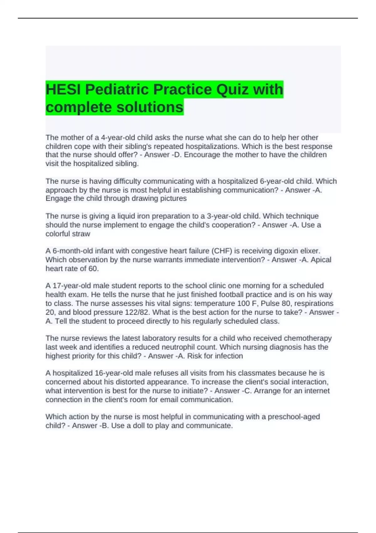 HESI Pediatric Practice Quiz with