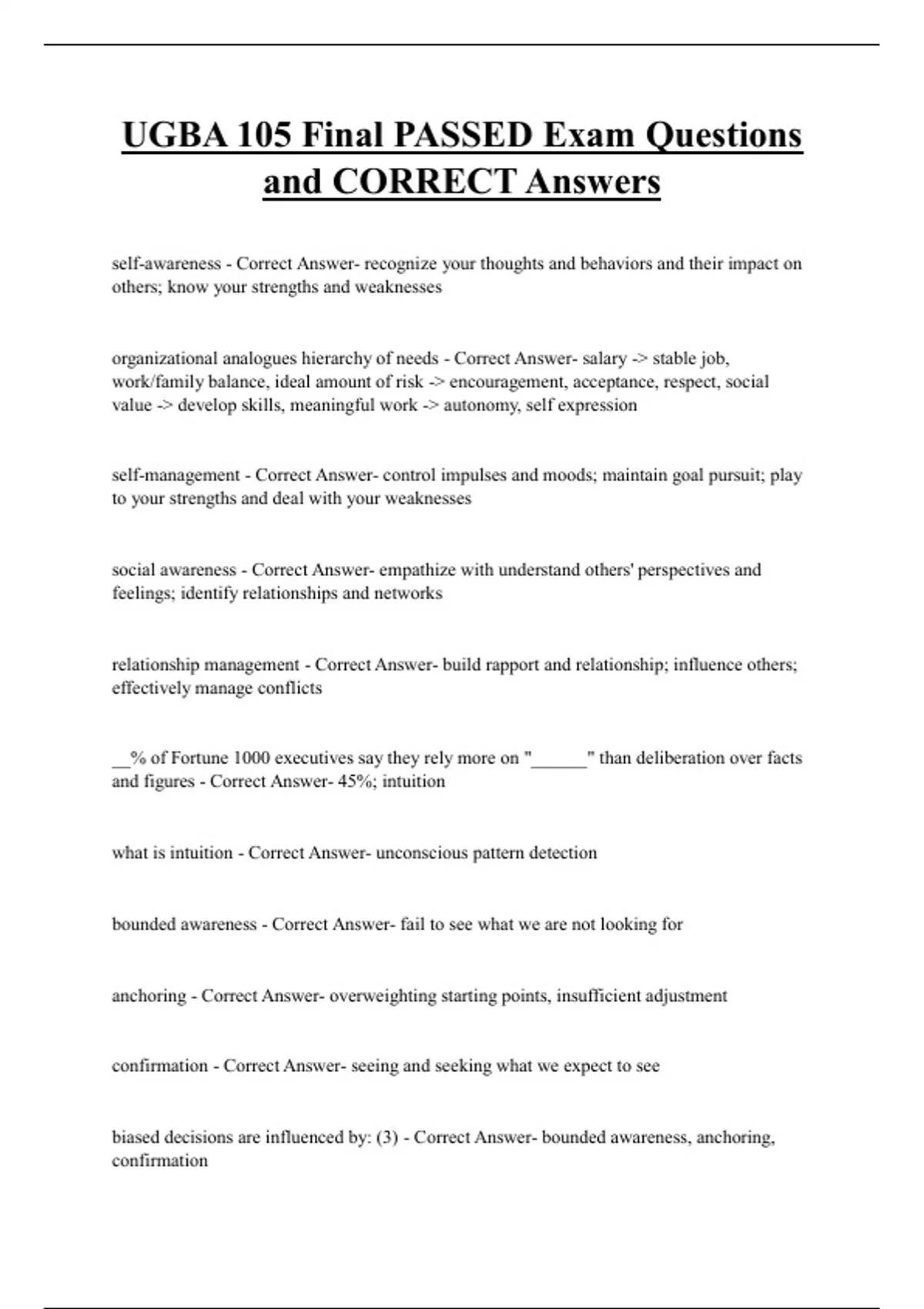UGBA 105 Final PASSED Exam Questions and CORRECT Answers self-awareness - Correct Answer- recognize your thoughts and behaviors and their impact on others; know your strengths and weaknesses organizational analogues hierarchy of needs - Correct Answer- salary -> stable job, work/family balance, ideal amount of risk -> encouragement, acceptance, respect, social value -> develop skills, meaningful work -> autonomy, self expression