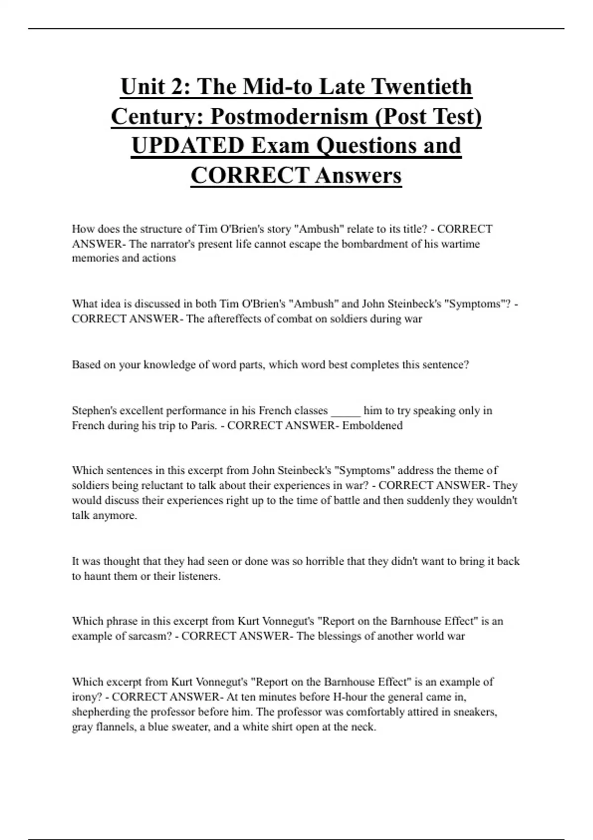 Unit 2: The Mid-to Late Twentieth Century: Postmodernism (Post Test) UPDATED Exam Questions and CORRECT Answers How does the structure of Tim O'Brien's story "Ambush" relate to its title? - CORRECT ANSWER- The narrator's present life cannot escape the bombardment of his wartime memories and actions What idea is discussed in both Tim O'Brien's "Ambush" and John Steinbeck's "Symptoms"? - CORRECT ANSWER- The aftereffects of combat on soldiers during war