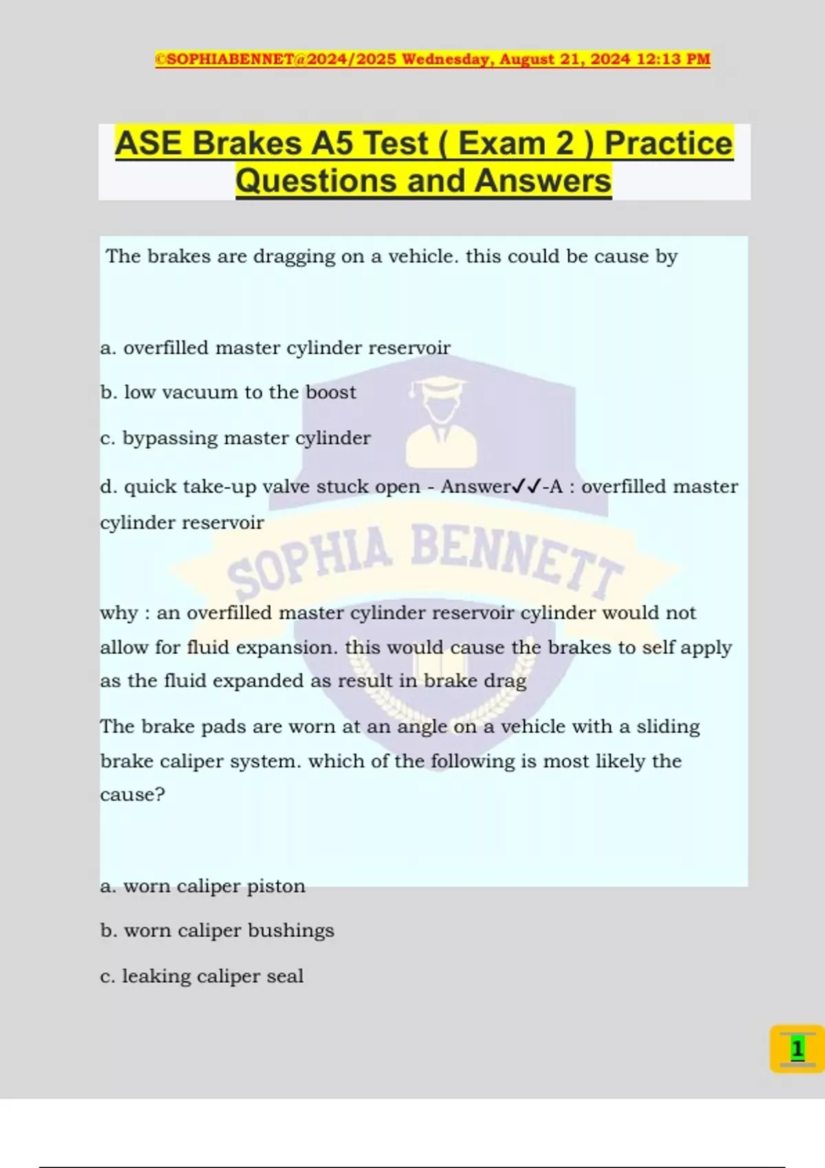 ASE Brakes A5 Test ( Exam 2 ) Practice Questions and Answers The brakes are dragging on a vehicle. this could be cause by a. overfilled master cylinder reservoir b. low vacuum to the boost c. bypassing master cylinder d. quick take-up valve stuck open - Answer️️ -A : overfilled master cylinder reservoir why : an overfilled master cylinder reservoir cylinder would not allow for fluid expansion. this would cause the brakes to self apply as the fluid expanded as result in brake drag The brake pads are worn at an angle on a vehicle with a sliding brake caliper system. which of the following is most likely the cause? a. worn caliper piston b. worn caliper bushings c. leaking caliper seal ©SOPHIABENNET@2024/2025 Wednesday, August 21, 2024 12:13 PM 2 d. leaking caliper boot - Answer️️ -B : worn caliper bushings why : worn bushings can cause the caliper to cock during operation. this could cause the pads to wear at an angle A diagnostic trouble code is set for an open wheel speed sensor on the left front sensor. The technician measures the resistance at the sensor and finds it to be within specification. Which of the following is the most likely cause for the wheel speed sensor code? a. faulty ABS computer b. open fuse c. open wiring from the computer to the wheel speed sensor d. shorted left front ABS modulator valve - Answer️️ -C : open wiring from the computer to the wheel speed sensor why : an open in the wiring from the sensor to the computer would cause a diagnostic trouble code to be set and the sensor to have the correct resistance The brake warning lamp pictured above (pg. 56) stays on any time the ignition switch is on. Tech A says this could be caused by a poor ground at the parking brake switch. Tech B says this could be ©SOPHIABENNET@2024/2025 Wednesday, August 21, 2024 12:13 PM 3 caused by a poor ground at the brake warning lamp switch. Who is correct? a. A only b. B only c. A & B d. neither A or B - Answer️️ -D : neither A or B why : neither technician is correct. there is a ground present at all times to cause the light to be on all the time Which of the following is true concerning the above