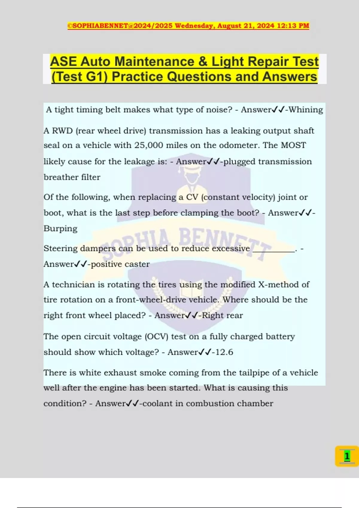 ASE Auto Maintenance & Light Repair Test (Test G1) Practice Questions and Answers A tight timing belt makes what type of noise? - Answer️️ -Whining A RWD (rear wheel drive) transmission has a leaking output shaft seal on a vehicle with 25,000 miles on the odometer. The MOST likely cause for the leakage is: - Answer️️ -plugged transmission breather filter Of the following, when replacing a CV (constant velocity) joint or boot, what is the last step before clamping the boot? - Answer️️ - Burping Steering dampers can be used to reduce excessive __________. - Answer️️ -positive caster A technician is rotating the tires using the modified X-method of tire rotation on a front-wheel-drive vehicle. Where should be the right front wheel placed? - Answer️️ -Right rear The open circuit voltage (OCV) test on a fully charged battery should show which voltage? - Answer️️ -12.6 There is white exhaust smoke coming from the tailpipe of a vehicle well after the engine has been started. What is causing this condition? - Answer️️ -coolant in combustion chamber ©SOPHIABENNET@2024/2025 Wednesday, August 21, 2024 12:13 PM 2 A front wheel drive vehicle has a clacking noise that only occurs while cornering. The technician suspects a faulty front axle. Which of these is most likely the cause? - Answer️️ -outer CV Joint The tread of a tire is worn in the center and not on the outer shoulders. Technician A says this is caused by an improper wheel alignment angle. Technician B says this is caused by an over- inflated tire. Who is correct? (Just the letter) - Answer️️ -B A vehicle with power assist brakes has a hard brake pedal. Which of these is the most likely cause? - Answer️️ -faulty brake booster Technician A says that oil should be squirted into all of the cylinders before taking a compression test. Technician B says that if the compression greatly increases when some oil is squirted into the cylinders, it indicates defective or worn piston rings. Which technician is correct? (Letter only) - Answer️️ -B During a cylinder leakage (leak-down) test, air is noticed coming out of the oil fill opening. Technician A says that the oil filter may be clogged. Technician B says that the piston rings may be worn or defective. Which technician is correct? (Letter only) - Answer️️ -B What precautions are needed to be performed to help prevent air from getting trapped in the cooling system when replacing coolant? - Answer️️ -Open the bleeder valve during filling To flush a hydraulic clutch system, what should be used? - Answer️️ -DOT 3 ©SOPHIABENNET@2024/2025 Wednesday, August 21, 2024 12:13 PM 3 The engine of a vehicle will start, but is slow cranking. Technician A says there may be resistance in the starter circuit. Technician B says to perform a voltage drop test to test for excessive resistance in the starter circuit. Who is correct? ("A" "B" or "Both") - Answer️️ - Both Technician A says a stuck open PCV valve will cause a lean fuel condition. Technician B says the PCV system removes blowby gases from the crankcase. Who is correct? ("A" "B" or "Both") - Answer️️ - Both A technician removes and replaces a worn lower radiator hose on a four cylinder engine. The vehicle overheats after the technician has replaced the hose and added coolant. Which of these is most likely the cause of this condition? - Answer️️ -air pocket Engine mounts were recently replaced on a front wheel drive vehicle with independent suspension. The vehicle now has a steady pull to the left at all speeds. Technician A says this is most