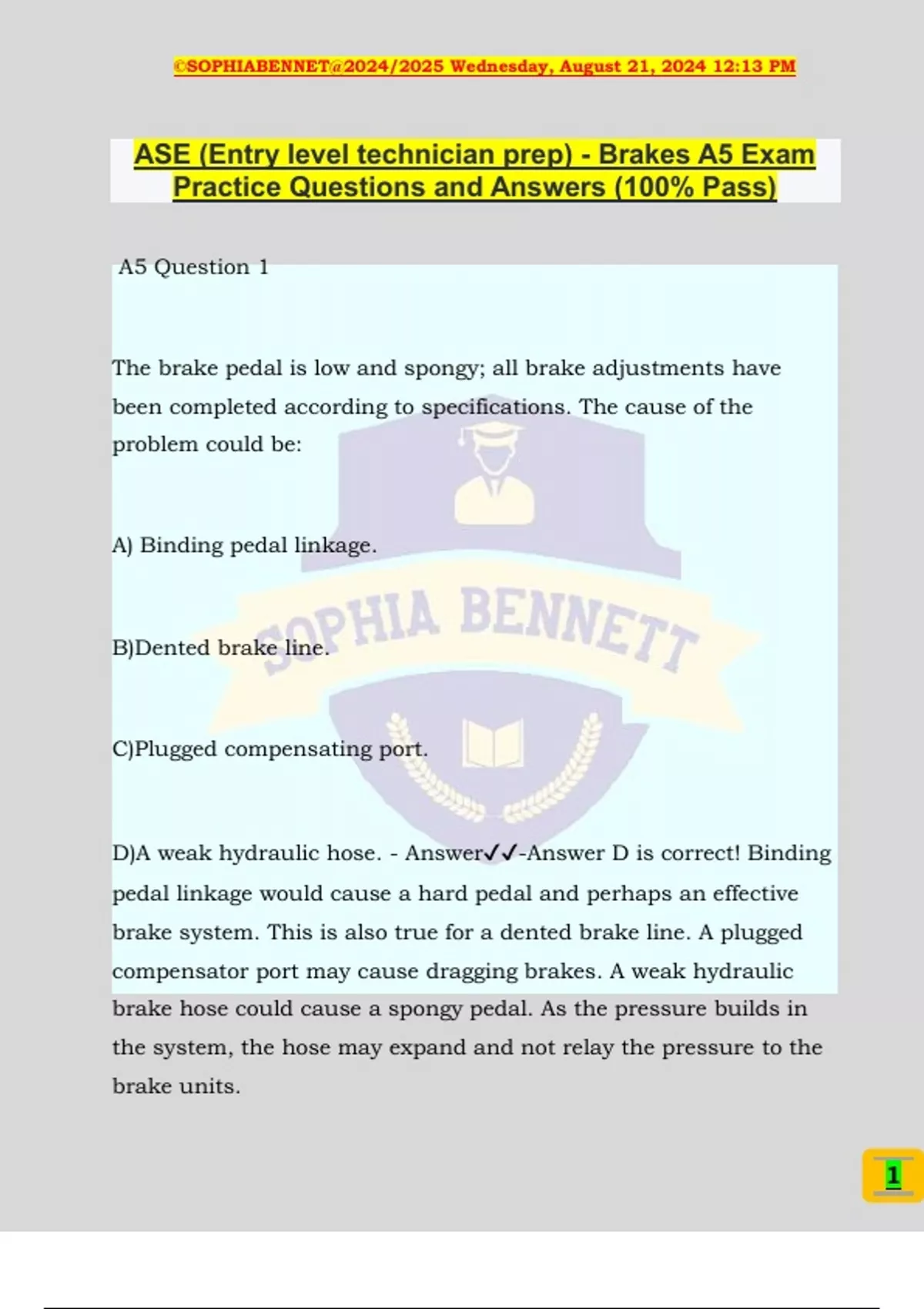 ASE (Entry level technician prep) - Brakes A5 Exam